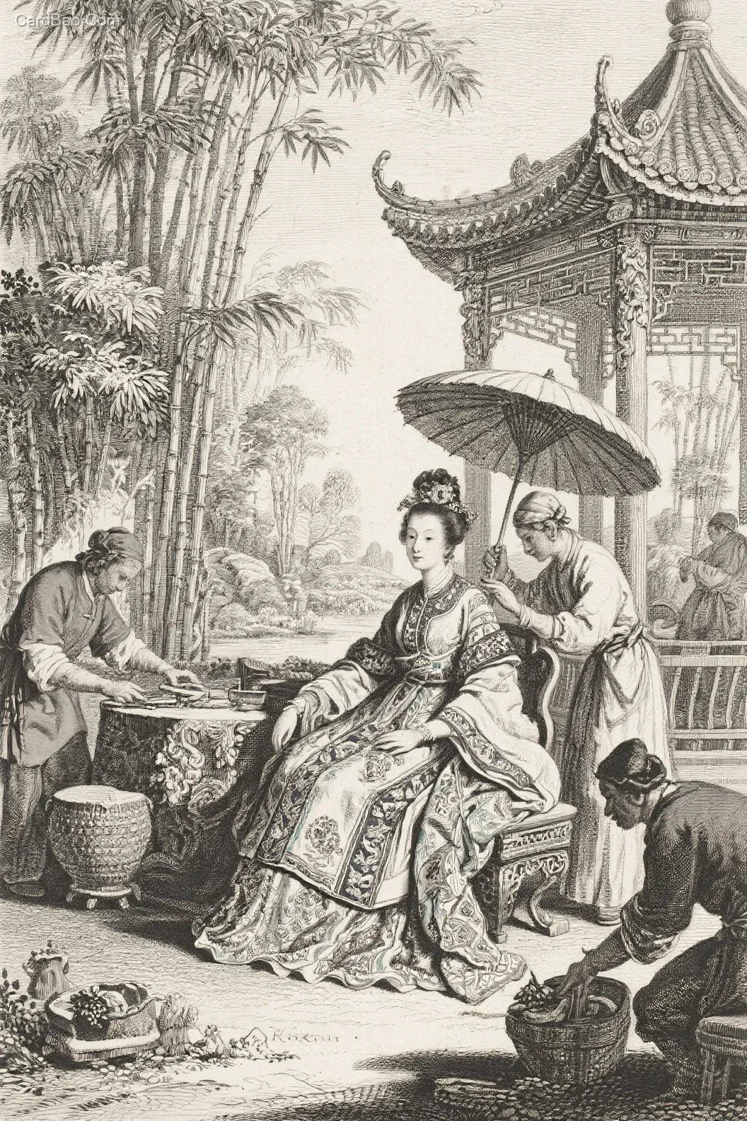 法国画家弗朗索瓦布歇的黑白铜版画作品,体现18世纪欧洲中国风艺术潮流,以中式园林为背景竹林、凉亭、人物穿改良版汉服,是典型的中国风创作,西方对东方文化的浪漫化想象。凉亭、伞盖、服饰,都带着异域猎奇色彩,反映18世纪欧洲对东方文化的追捧与误读。人物姿态慵懒、场景繁花簇拥,贵族化的东方女性,居中而坐、衣饰华丽,侍从与工匠侍奉、劳作,这幅画是18世纪欧洲中国风的典型,借东方符号演绎洛可可式的浮华浪漫,是西方文化想象的产物