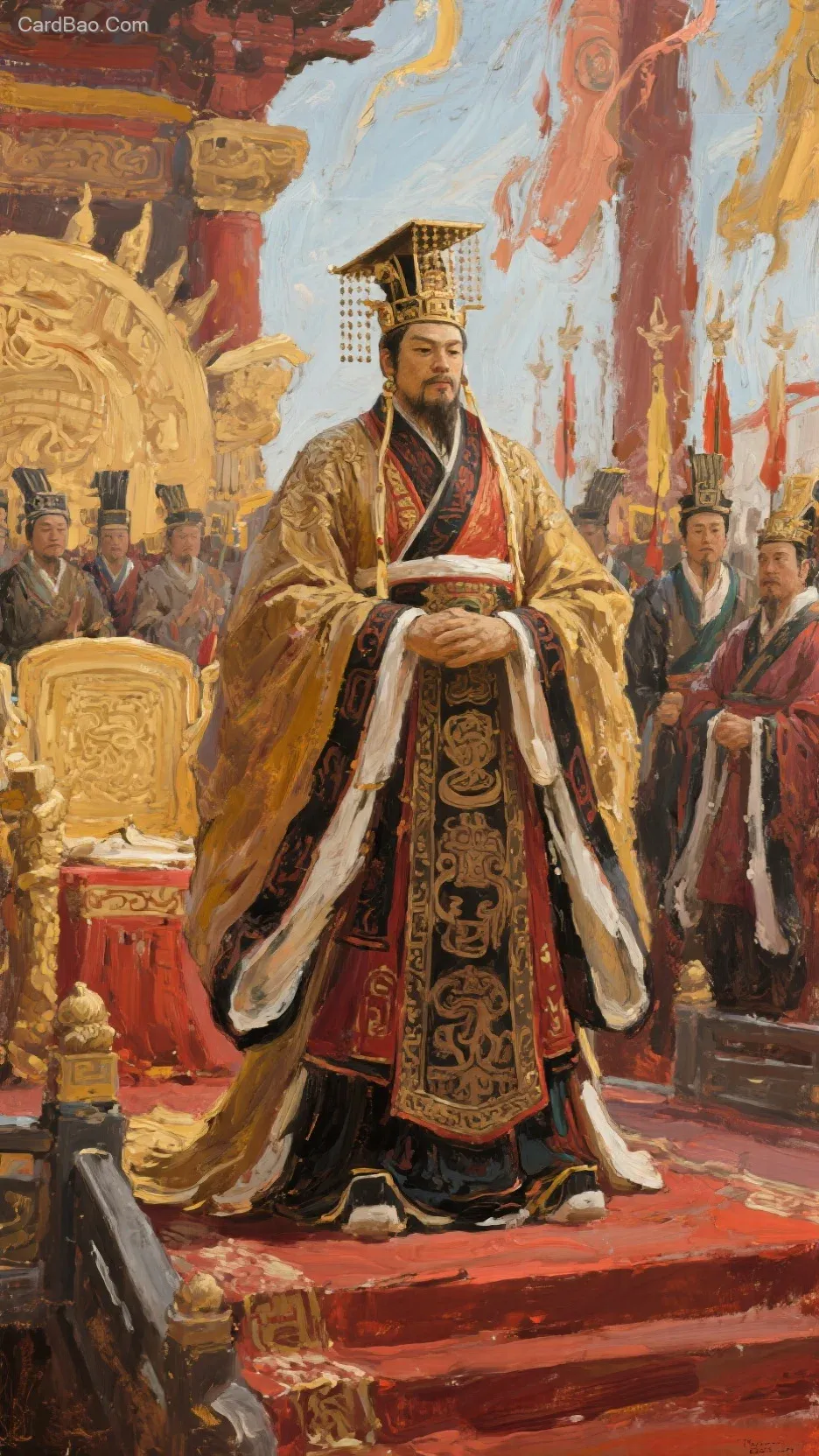 秦始皇进行登基大典的全身像,场景为登基大典现场,前苏联烈宾油画风格,全身像,庄重、宏大,厚涂、笔触明显、有虚实层次、随意感