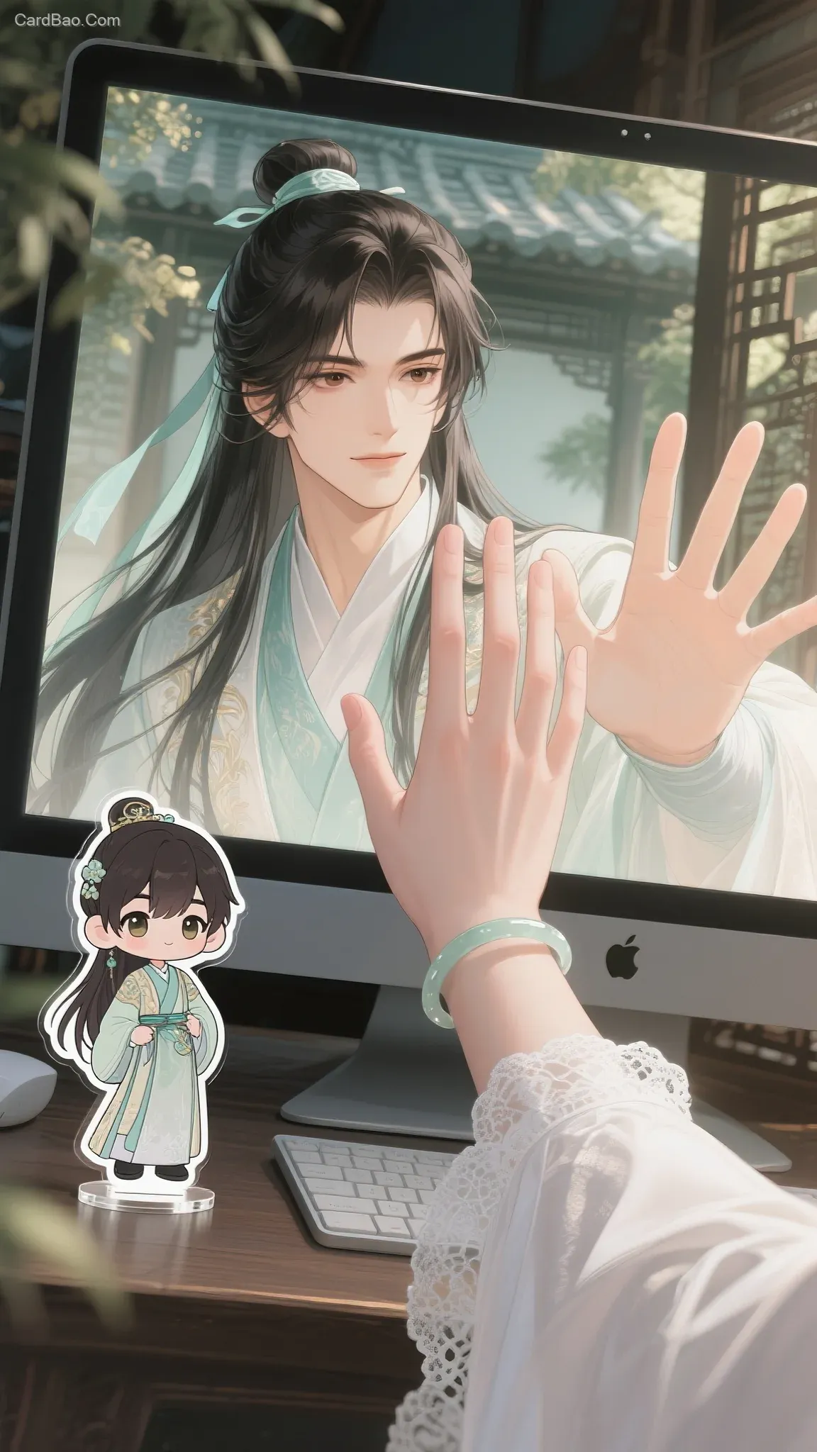 Male, with long dark hair, wearing a light-colored sheer Hanfu and a matching hairband, set in an ancient-style courtyard. Noise reduction applied, with a low-saturation color palette. The character is inside a computer screen, raising a hand toward the lens (viewer's perspective) with the palm pressed against the screen as if stepping out, a slight smile at the corner of the lips. In another perspective, a hand wearing a delicate jade bracelet (with white lace sleeves) reaches toward the male character, palm to palm with the screen. Beside the computer, there is a Q-version standee of the character in the same style. Soft focus, luxurious lighting, illustration style, gentle lighting, comic book aesthetic, extreme composition, grotesque aesthetic, brushstroke texture, emphasis on texture, exquisite CG, concept art, high level of detail, viewer's upward perspective, BJD doll-like features, close-up facial shot, texture emphasis, 3D CG rendering, 3D thick painting, finely detailed and glossy hair strands, OC rendering.
