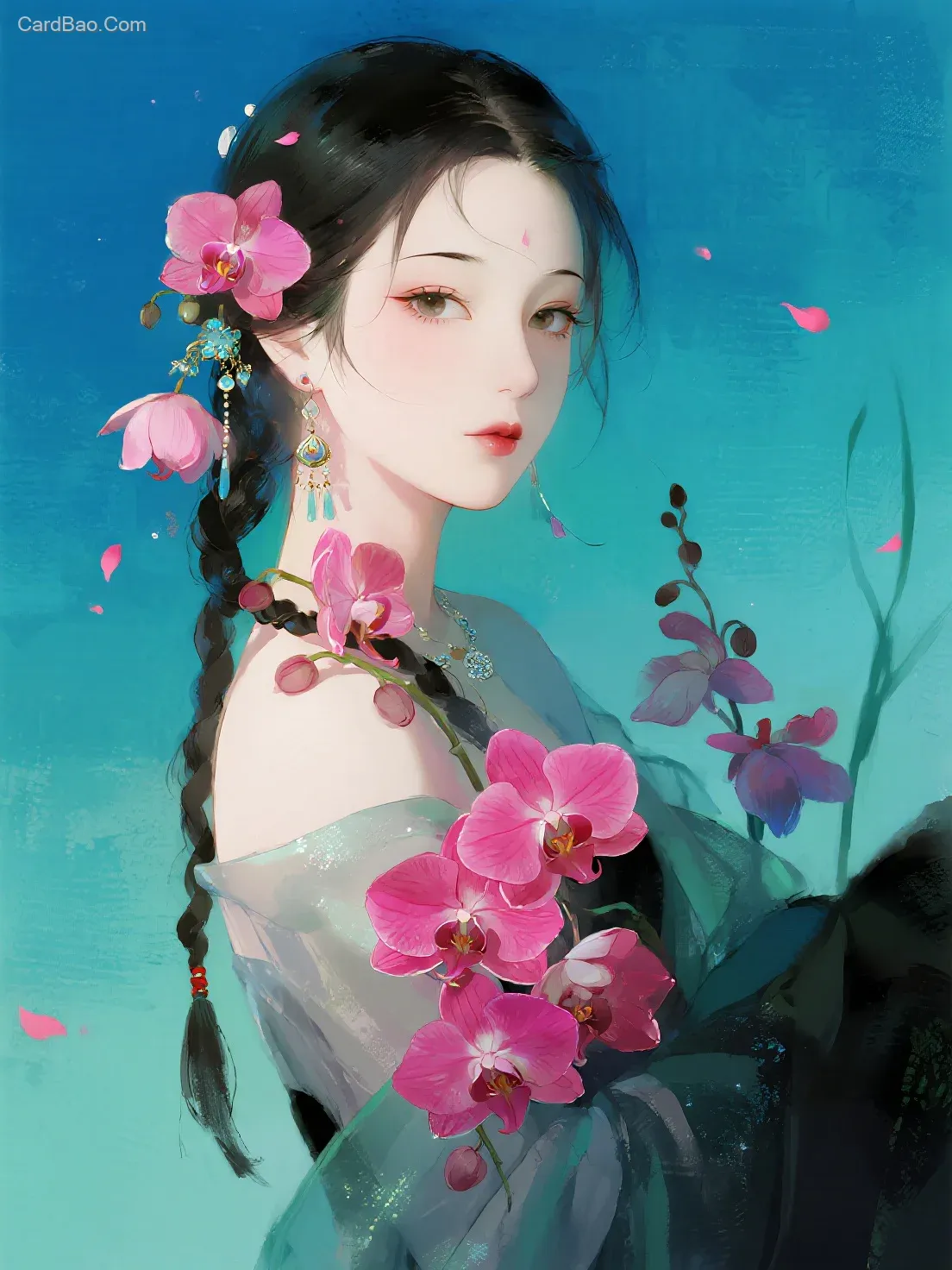 魔幻光晕,无明显边界,暗黑渐变意向展开弥散轮廓,纯色哑光渐变磨砂背景,抽象创意,纠缠的纯色域阀值放大,岩彩绘画仕女,水彩晕染光影,这幅画是国风插画,一位女子居于中心。她长发编辫,发间、周身簇拥着硕大艳丽的粉色兰花,花瓣层次丰富,花蕊点缀细碎装饰。身着飘逸纱裙,配饰精致,姿态优雅。背景是蓝绿渐变的清新色调,点缀粉色花瓣,营造出浪漫、梦幻的氛围,将自然花草与人物融合,尽显东方美学韵味 。肌理感,工笔,暗角,微光,留白,磨砂,禅意,国风,弥散光影