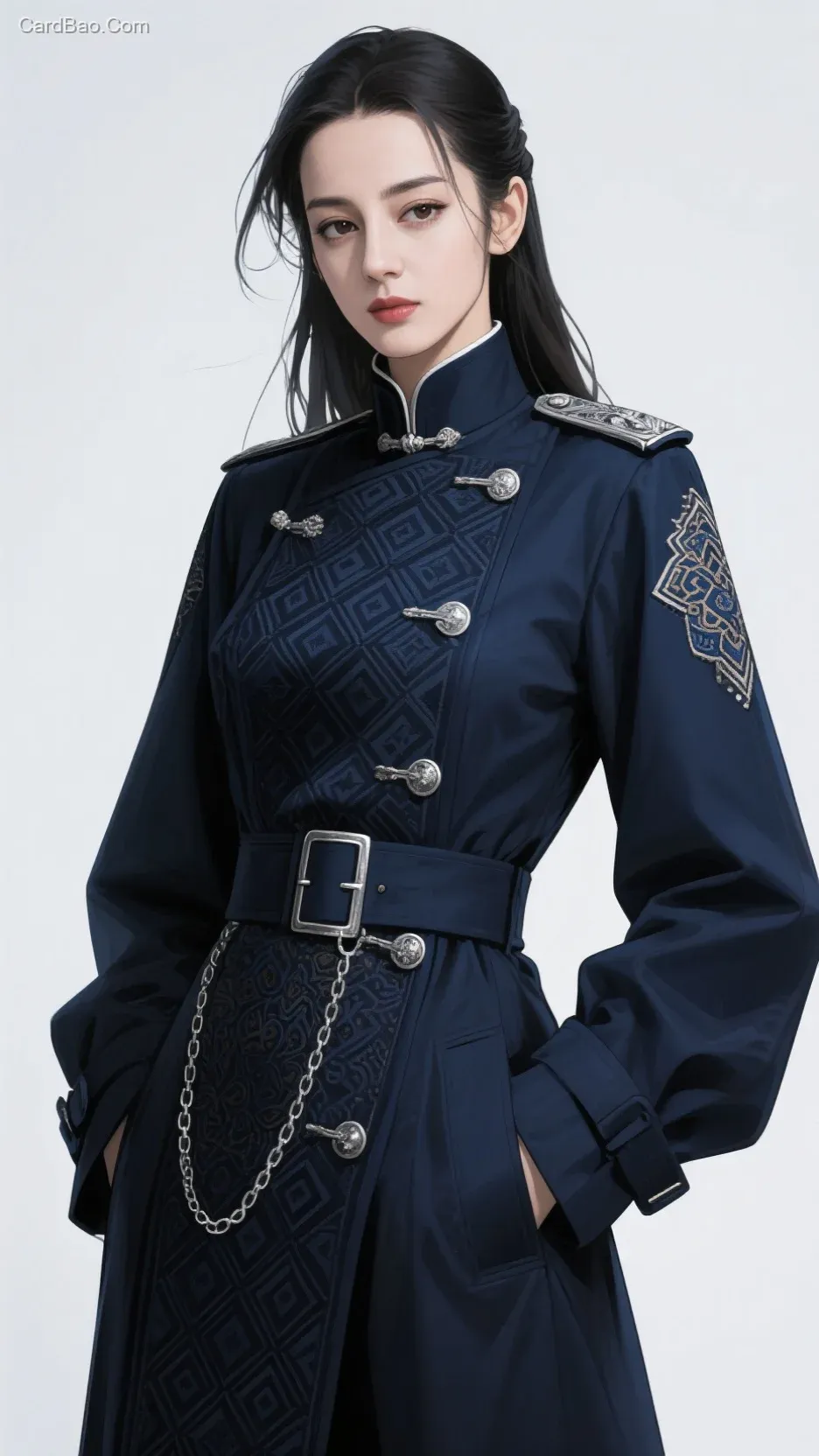 Dilraba, with three-dimensional and handsome features, cold and aloof, messy yet layered, wearing a slim-fitting Republican-era stand-collar trench coat in navy blue twill fabric with Miao embroidery geometric patterns, a silver chain frog closure belt, tin embroidery epaulettes, loose cuffs, British style.