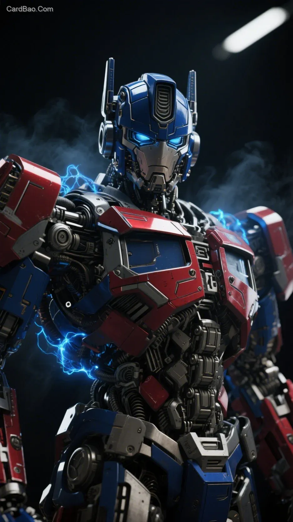 博派擎天柱,微距拍摄,正面肖像视角,镜头聚焦脸部,机械身体结构立体,线条硬朗,充满力量感。整体造型棱角分明,超写实的金属纹理和机械构造,红蓝配色机甲。