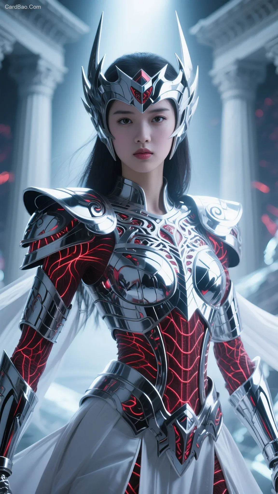 Ultra 3D modeled lifelike young woman, with cold porcelain skin flushed with a natural rosy glow, strikingly resembling Wang Zuxian. Dressed in pneumatic muscle fiber bundle armor, styled after the Athena Saint Cloth of the Underworld Saints. Features extremely intricate patterns and light-shadow special effects. Gazing sharply down at the camera in 1000000000000K ultra-high definition.