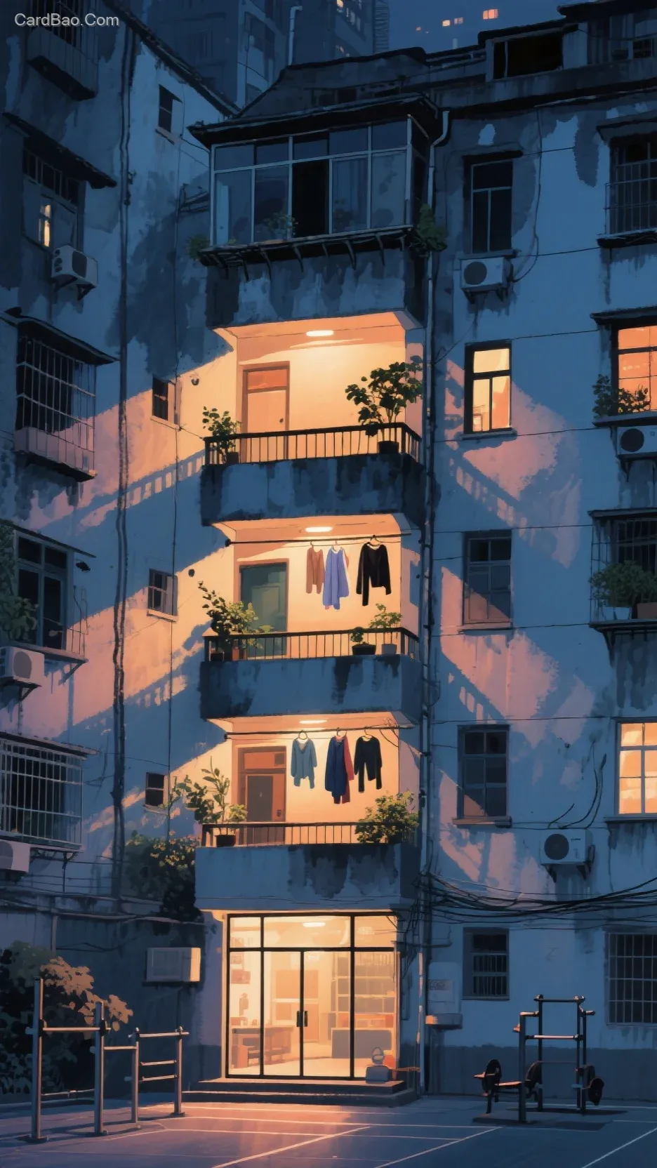 水墨画水彩晕染,用简洁而流畅的线条勾勒出城市的老城区,老式楼房,每层有3户住户,阳台,栏杆,植物,落地玻璃,错落有致,楼下有健身区域,治愈的画面,夜晚,灯光,楼房外挂着衣服,明暗对比,光影交错,多角度拍摄,影子叠加,线条简洁流畅粗细有致富有韵律感,负空间设计强烈的设计感立体感层次感,艺术感,霓虹渐变创意背景,普鲁士蓝与琥珀色基调