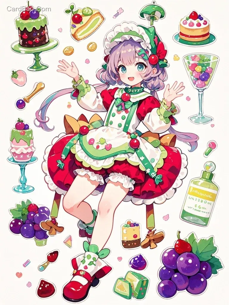 Kolling布局,一个可爱的拟人葡萄蛋糕,上身套装,下身短裙,可爱的配饰,卡通设计,全身,主体周边各种小物品,平面插图,贴纸风格,描边线条,森系水彩,高细节,高分辨率,二次元