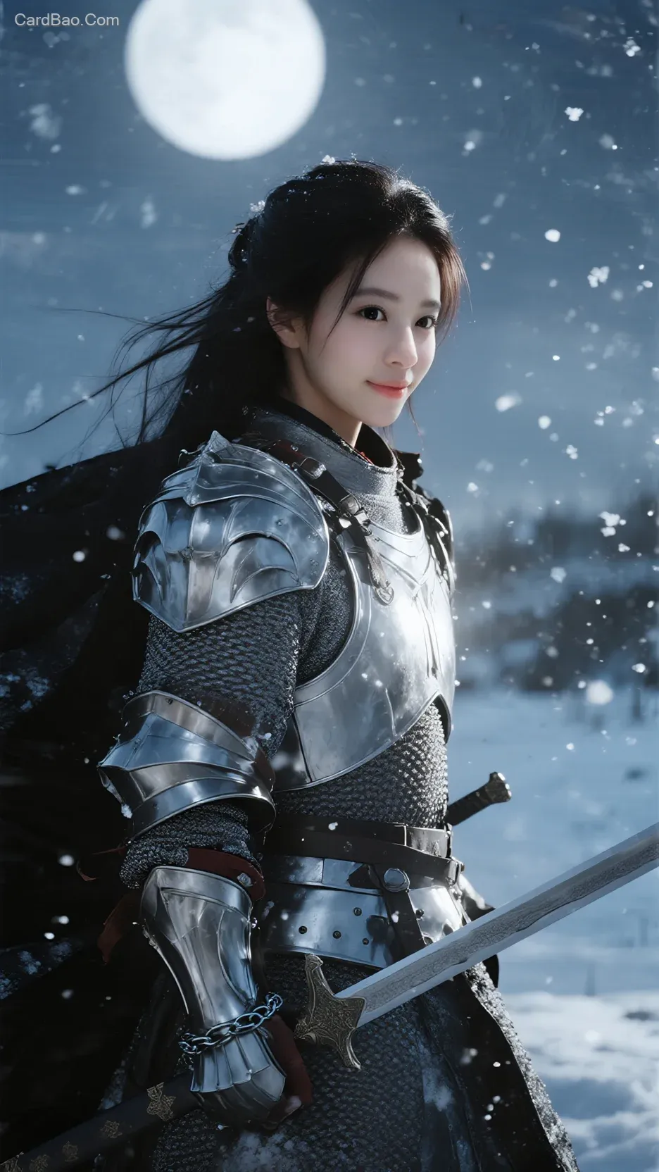 ##古风女神级美人,玄铁刀链缠霜腕,立于暴风雪中墨发狂舞。刀尖挑起碎雪洒向月光,银甲折射寒芒,眼神孤狼般野性逼人。广角运镜