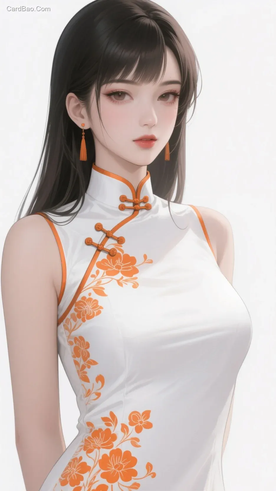 御姐,白色旗袍,橙色花纹,斜刘海,披肩发,白色背景,写实风格,动漫风格,CG厚涂,8k