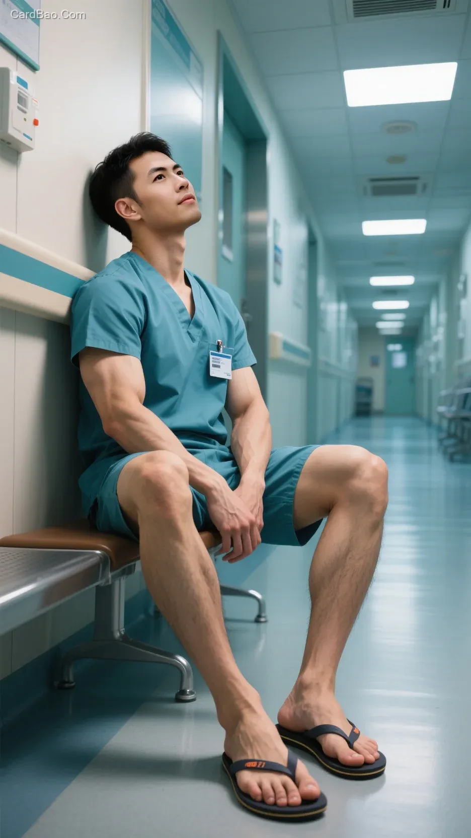 ##在超现实艺术风格中,以16K超写实画质,医院手术室外休息区背景,肌肉发达的中国帅哥夏季男护士套装,赤脚人字拖坐在走廊中间,头靠着墙面,眯着眼休息,采用广角仰视特写镜头,强烈艺术感构图,脚趾翘起,正轻微颤动,光影精准地凸显脚部每一处细节。