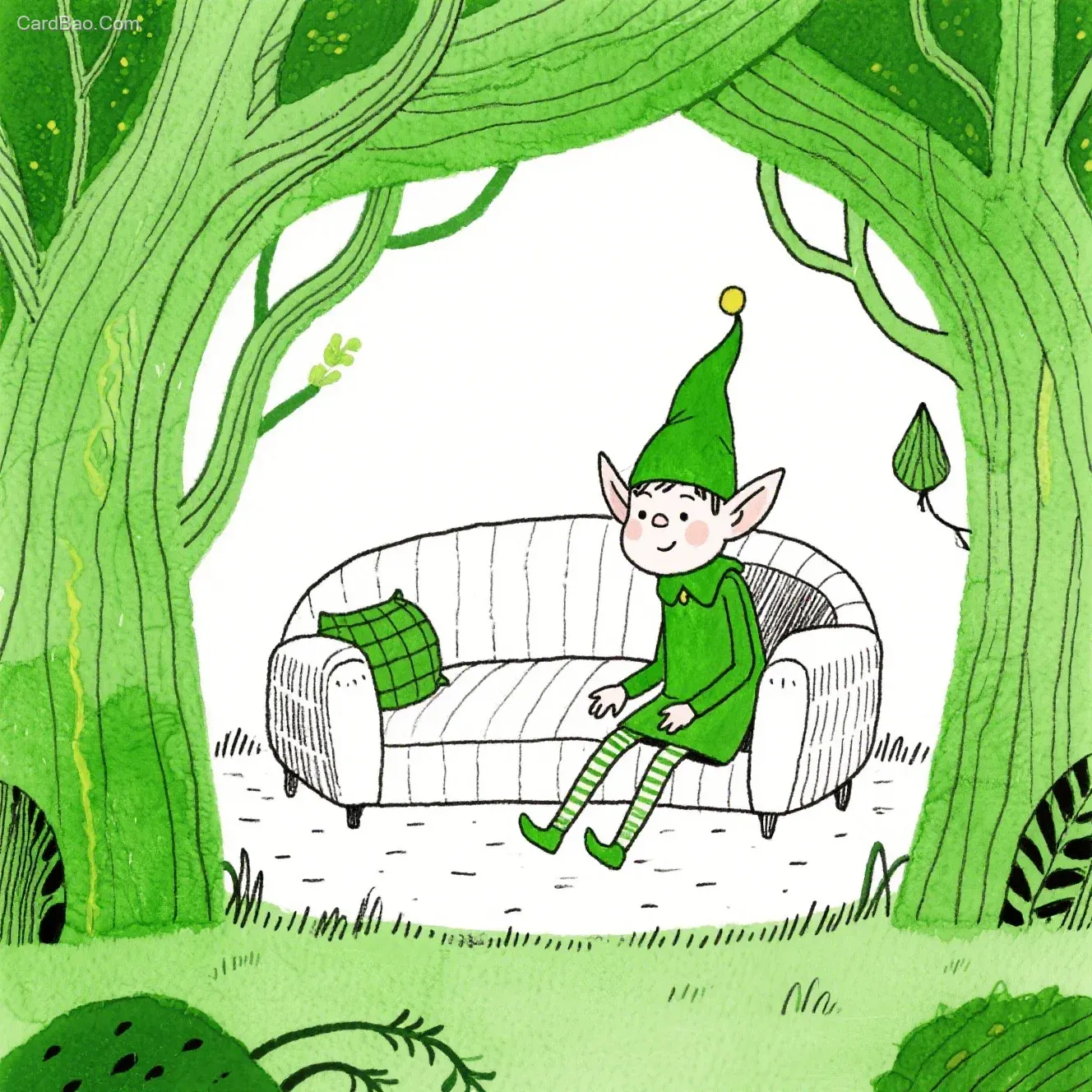 Illustration in the style of Raymond Briggs and Mattias Adolfsson, white clean background, using a mixed media of pen and watercolor. A cozy scene from a Green Elf story --style raw --stylize 450