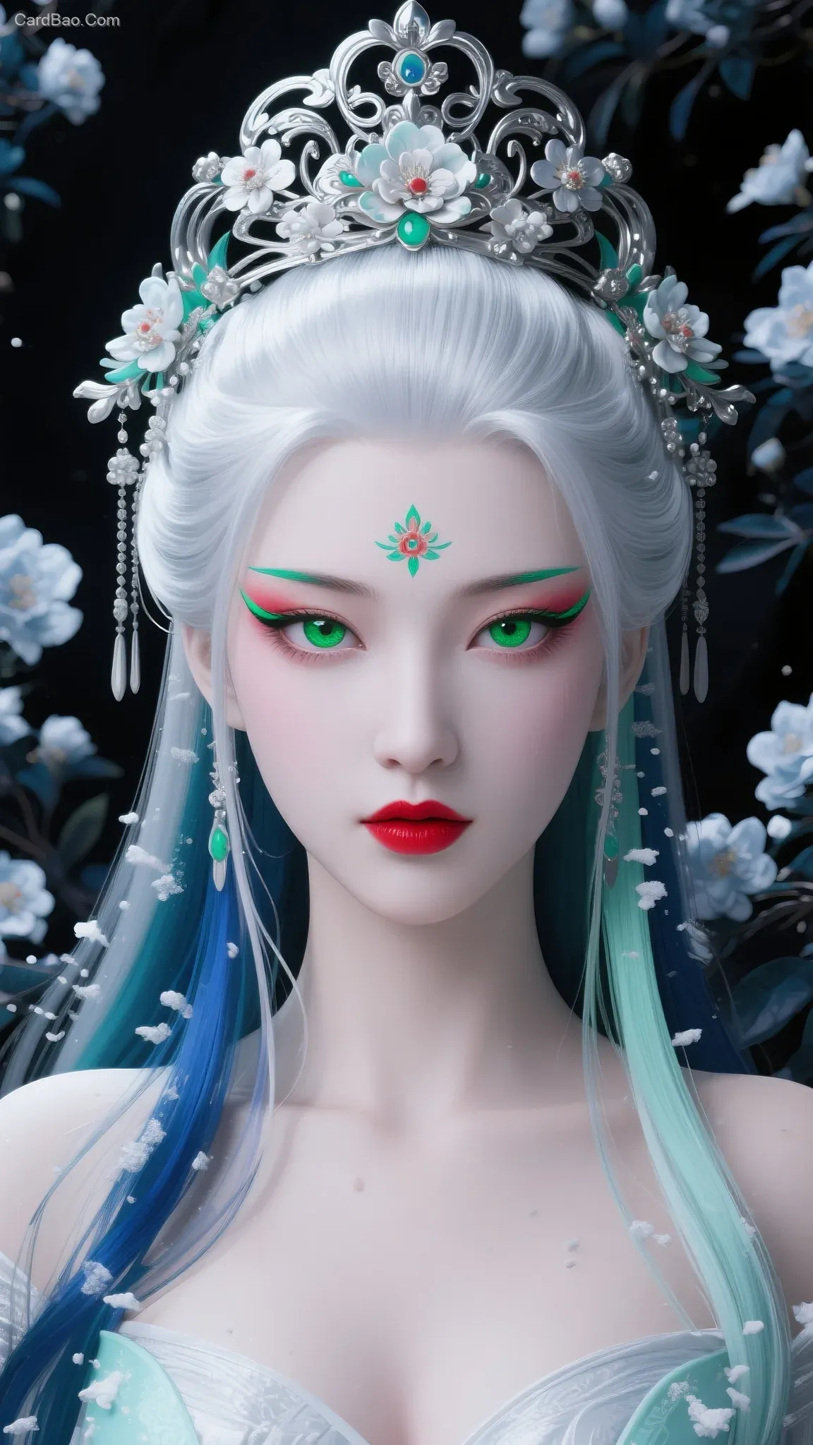 特写镜头锁眼!她正面凝视你,**双眼竟是透亮的翡翠绿!眼尾用孔雀绿画夸张上挑眼线。银丝发冠,长发散落靛蓝挑染 飘雪染成薄荷色,月光惨。烈焰红唇唇纹超清,华丽繁复花朵发饰,丰满美胸设计,背景繁花似锦,氛围诡异华丽,超清凝实真实皮肤颗粒质感,88888k超清冷白凝实红润细腻肌肤,肌肤白嫩水光光泽。