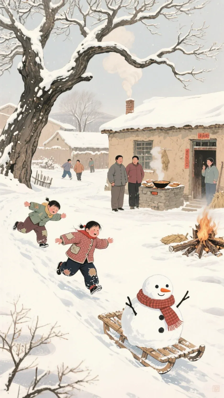 Children, dressed in patched yet cleanly washed cotton-padded jackets and trousers, laughed and played joyfully in the snow. Some rode homemade sleds, speeding down small earthen slopes and sending sprays of snow flying; others gathered to build snowmen, using carrots for noses, coal briquettes for eyes, and even wrapping their own scarves around the snowmen’s necks, each snowman looking charmingly naive and delightful.