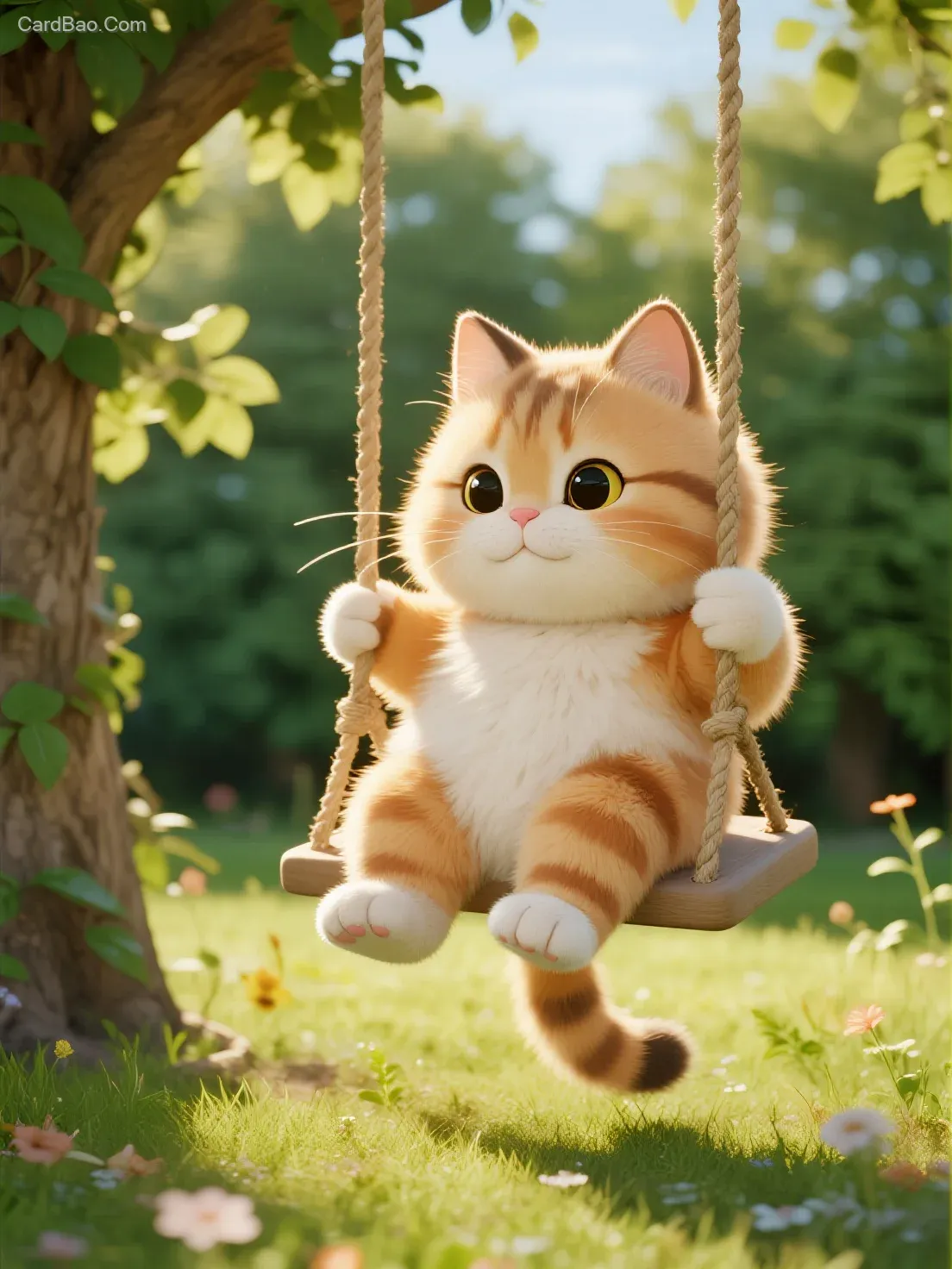 A personified fluffy cat swinging on a swing in a sunlit meadow, 3D rendered, medium shot, warm and cozy atmosphere, exquisitely minimalist.