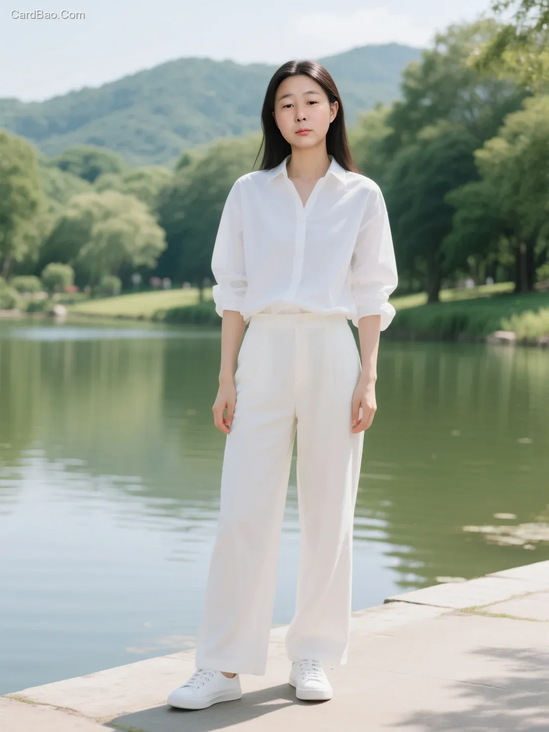 ##一个优雅知性女性,长发,烂番茄色唇彩,上身一件宽松白色身衬衫,挽起袖子,下身阔腿裤,白色板鞋,身材高挑,比例匀称,站在公园的湖边,正面看着镜头。全身特写,青山绿水,阳光明媚,高清画质,真实风格,佳能单反相机风格。,少女相机风范