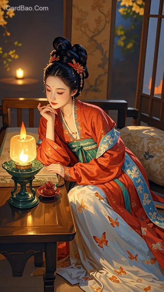 Ancient-style illustration, 2D, masterpiece, high quality, night scene, ancient-style woman, exquisite facial features, snow-white complexion, wearing her hair in a "paojia" bun, dressed in an ancient-patterned double-butterfly cloud-shaped thousand-water skirt, sitting on a noble consort's couch, elbow resting on a tea table supporting her head, with an oil lamp, rich in details, high resolution.