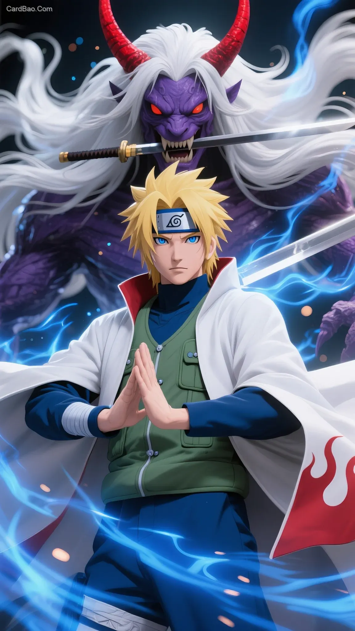 3D realistic style of the Fourth Hokage, Minato Namikaze, with his iconic flowing golden hair rendered in fine detail, strands clearly defined. The hair on both sides frames his face, while his bangs sweep to the right, revealing the blue ninja headband with its fluttering strap. His deep blue eyes radiate a calm yet sharp intensity. He stands tall, wearing a white Hokage cloak that billows dynamically, its tail adorned with a red flame pattern. Beneath the cloak, his blue Konoha ninja attire and green vest are partially visible. The shot is a close-up, capturing his hands clasped together in a hand seal formation. Behind him looms a massive demon with long white hair, red horns, and purple skin, facing forward with a sword clenched in its teeth. The demon is draped in a large white cloak, and the space around it distorts with swirling blue chakra particles. The composition uses an ultra-wide-angle, low-angle shot looking upward. PBR materials ensure highly detailed and realistic skin textures. The scene conveys rapid movement with motion-blurred afterimages from his Body Flicker Technique. Blue chakra energy envelops his entire body, and multi-layered depth of field enhances the visual impact, creating light spots and residual blurs from the jutsu.