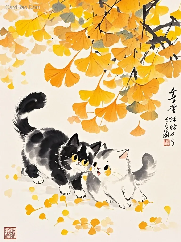 可爱的两猫猫在银杏树下玩耍,一只黑猫一只白猫卡通,水墨画