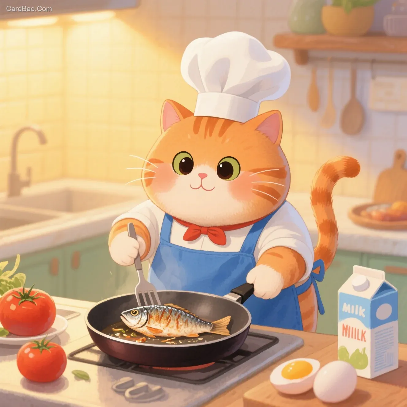 一只圆脸大眼的橘色胖猫,戴着白色厨师帽,系着蓝色小围裙,正在厨房用平底锅煎鱼,尾巴翘起,眼神专注。周围有番茄、鸡蛋和牛奶盒,暖黄色灯光,柔和水彩风格,4k高清,细节精致,超可爱治愈 --style raw