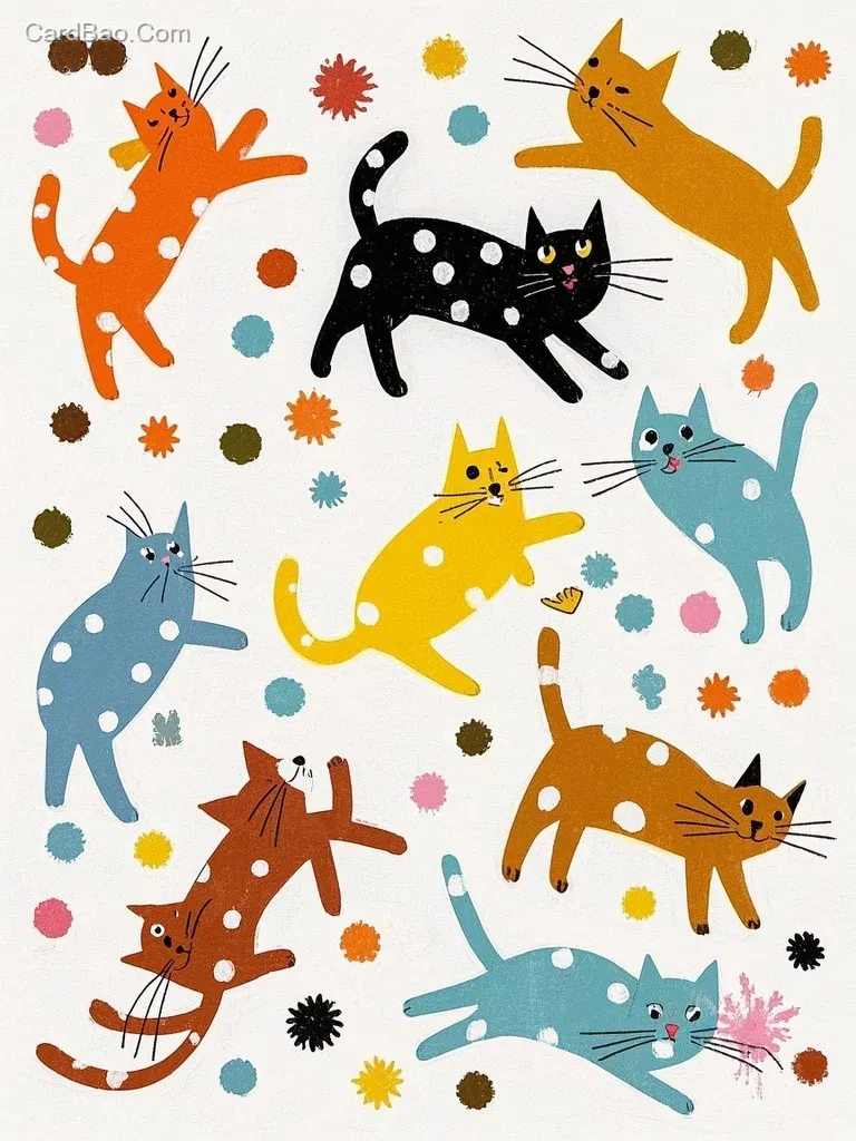 主体:许多小猫,抽象风格,猫偏瘦、动作、表情各不相同。小猫颜色:小猫颜色各不相同,身上有波点图案。风格俏皮又卡通。风格俏皮超现实,边缘柔和圆润,营造出梦幻般的氛围。治愈插画色调搭配。毛球,蝴蝶结做点缀。