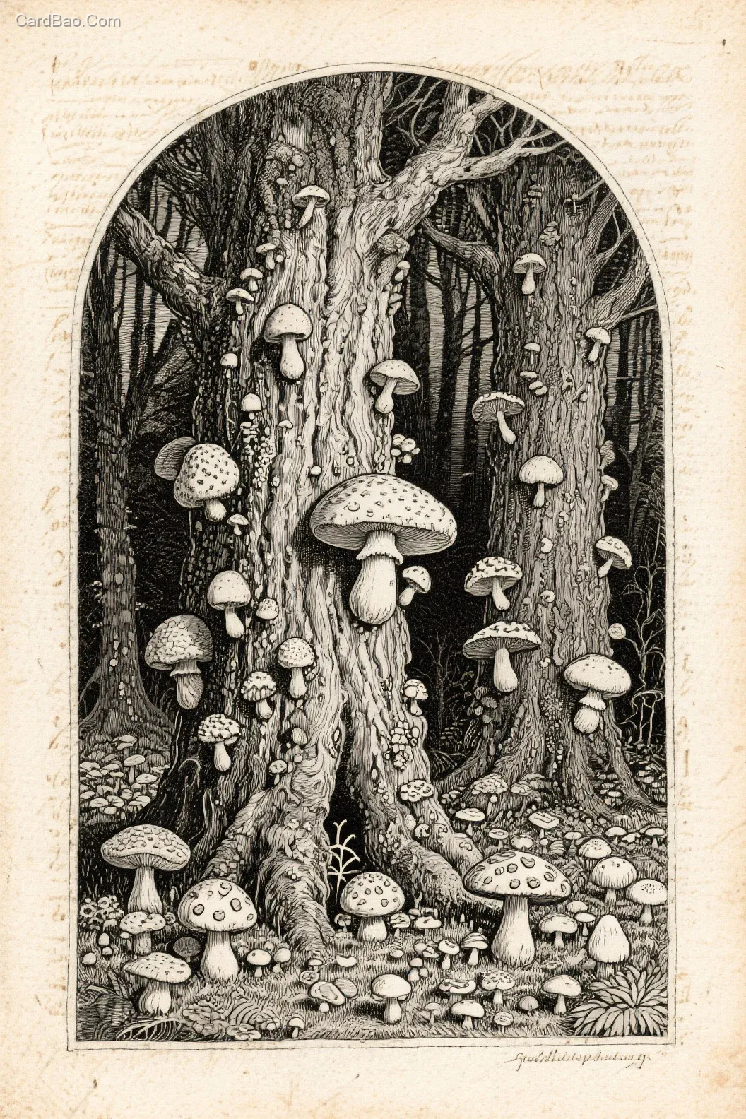 A black and white copperplate engraving depicting a fantastical forest scene, featuring two robust ancient trees as the main subjects. The tree trunks are adorned with various types of fungi, and the ground beneath is covered with an array of mushrooms, creating a mysterious natural atmosphere. The composition is framed within an arched border, rendered in the style of medieval manuscript illustrations. Set against a vintage paper background, it combines natural ecology with artistic decoration, showcasing a tranquil yet vibrant microcosm of the forest.