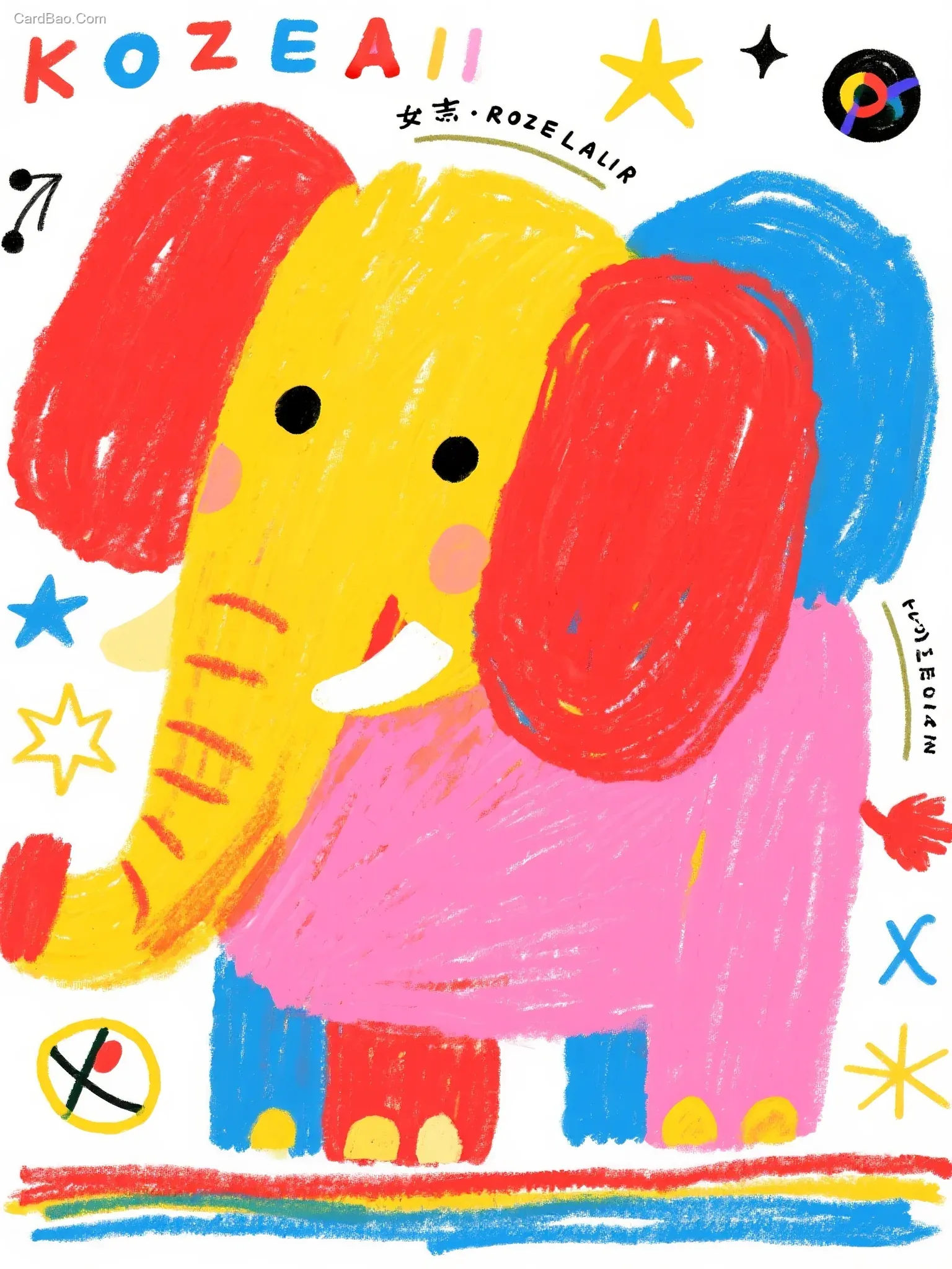 以蜡笔画的风格绘制可爱的大象形象插画,插画家安吉 •罗泽拉尔 Angie Rozela,解构主义,颜料涂抹有肌理感,手绘,夸张的形象,背景可根据内容添加星星,运动符号等抽象图案,画面可配上独特文字,营造活泼有趣的视觉效果。只用红黄蓝粉四种颜色绘制,康定斯基。