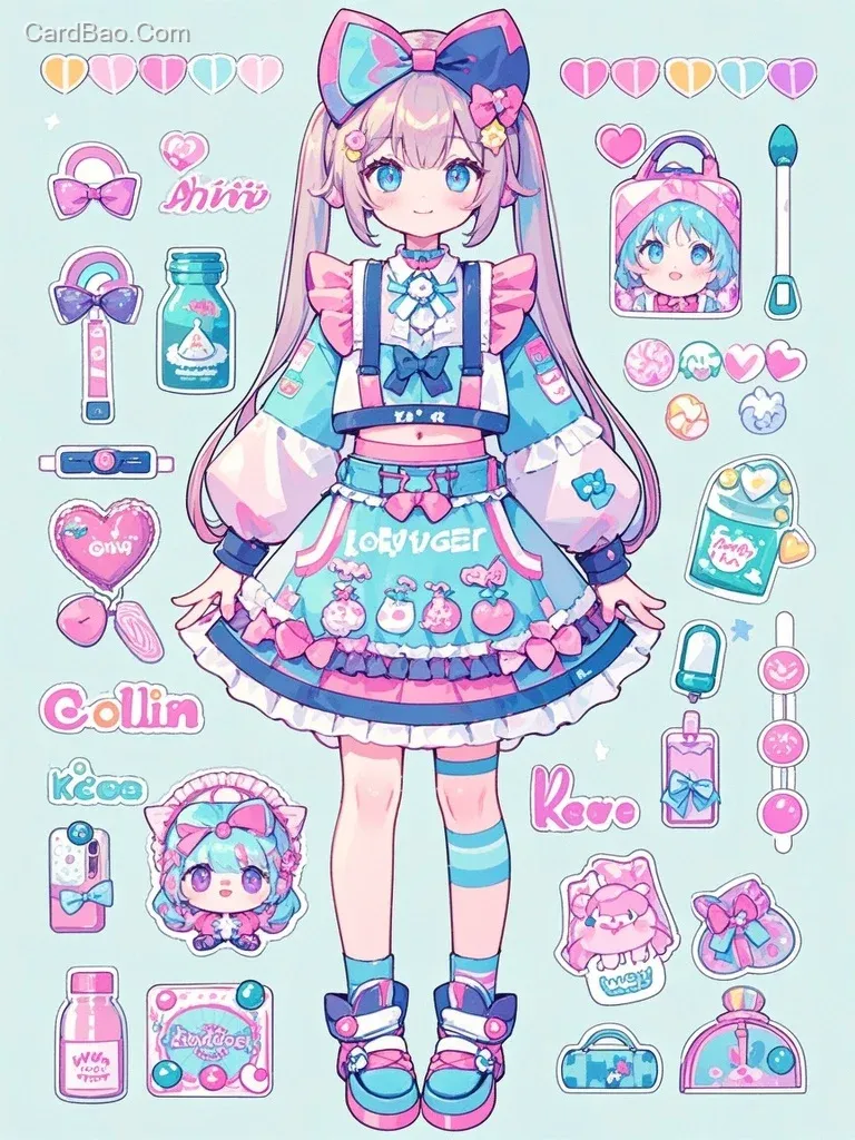 Kolling布局,一个可爱的拟人糖果,上身套装,下身短裙,可爱的配饰,卡通设计,全身,主体周边各种小物品,平面插图,贴纸风格,描边线条,森系水彩,高细节,高分辨率,二次元