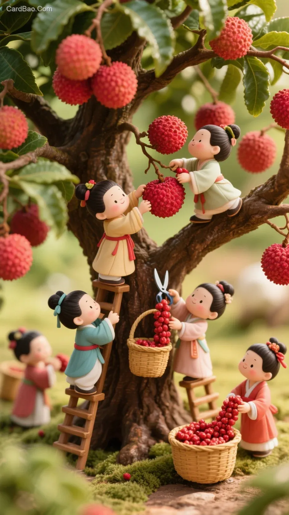 A miniature scene unfolds beside a lychee tree, where a group of adorable little figures dressed in Hanfu are busy picking lychees. Each lychee is plump and full, with a bright red shell as enticing as a ruby, and every cluster is larger than the little figures themselves. The tiny people climb along the sturdy trunk of the tree or stand on specially made high stools, carefully snipping off the lychee clusters with small scissors and placing them into bamboo baskets. The lychee tree’s branches are thick and its leaves lush, with a gentle breeze carrying waves of sweet fragrance through the air. The scene focuses on the meticulous movements of the little figures as they harvest the lychees, as well as the vibrant fruit and the lush tree forming a beautiful picture, capturing the joyful atmosphere of a bountiful orchard harvest.