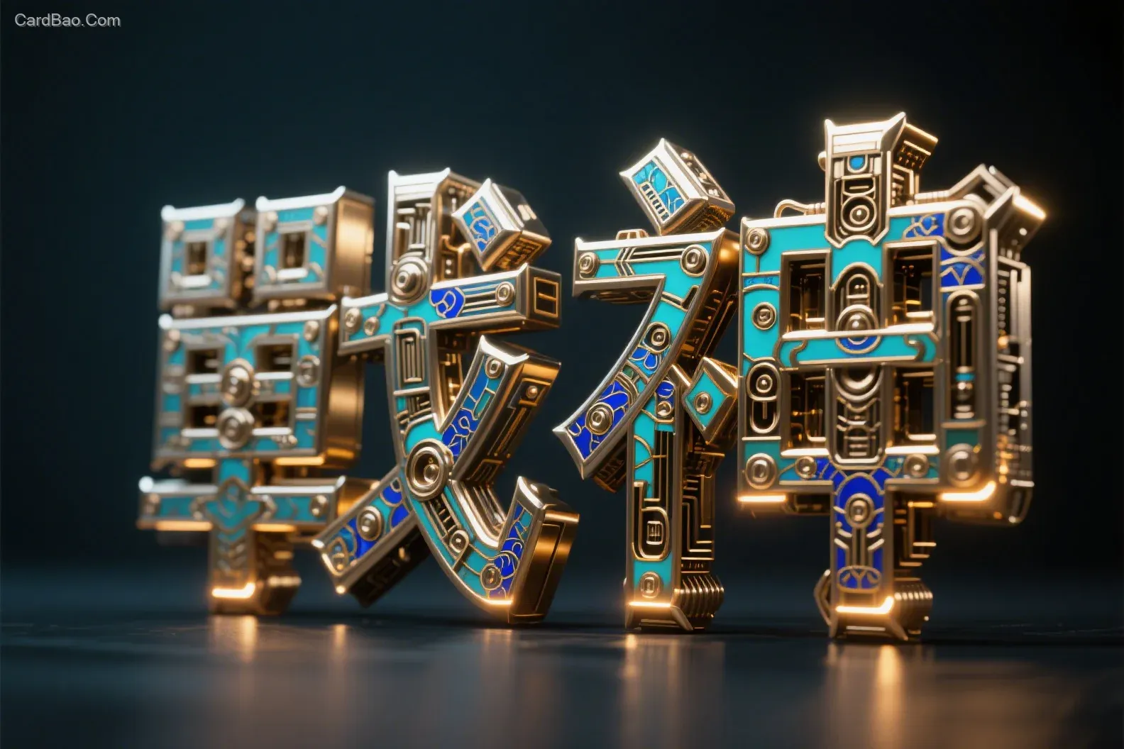 机械化的文字,“戰神”,字由各种精密零件组成,形成一个复杂的立体结构,字体由金属材质铸成,景泰蓝风格,珐琅工艺,边缘发光,内发光,炫光,边缘光,三维立体,阴影,金属质感,OC渲染,深色简约背景,高清画质