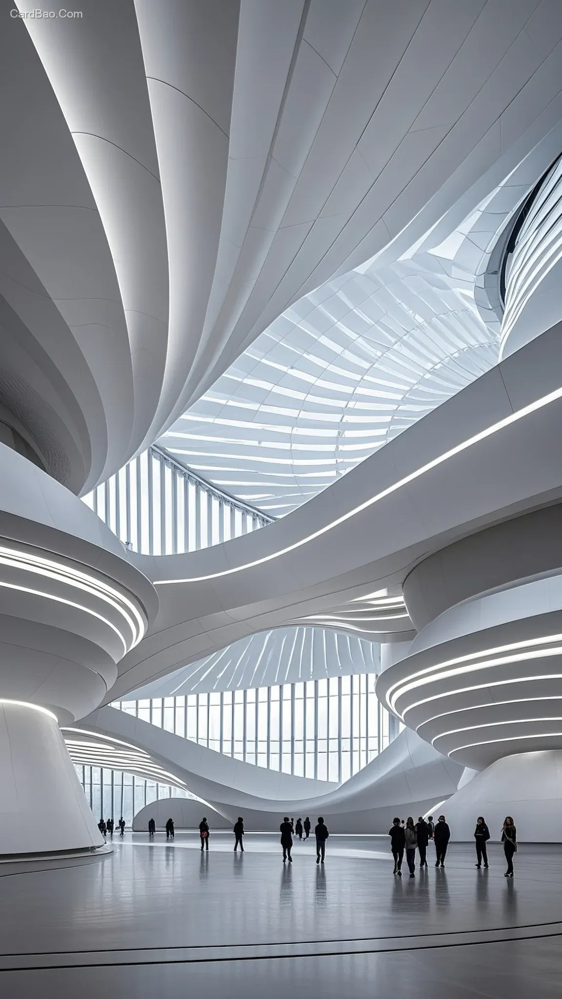 【Form Description】: Composed of large, smooth curved surfaces with gradual sweeps, cross-bridging overlaps, interlocking penetrations, and tearing dislocations. Smooth, flowing curved surfaces seamlessly connect with straight surfaces, featuring extremely narrow chamfered edges. The silver-white metal surface is flat, smooth, and warm with a lustrous reflection. The ceiling is a large, flat, luminous soft membrane made of semi-transparent material, featuring holographic projection and virtual imaging, with an extremely narrow frame. Rectilinear, truncated, vaulted, emphasizing verticality, bifurcation, juxtaposition, and morphology. Organic in nature, with a sense of procession.