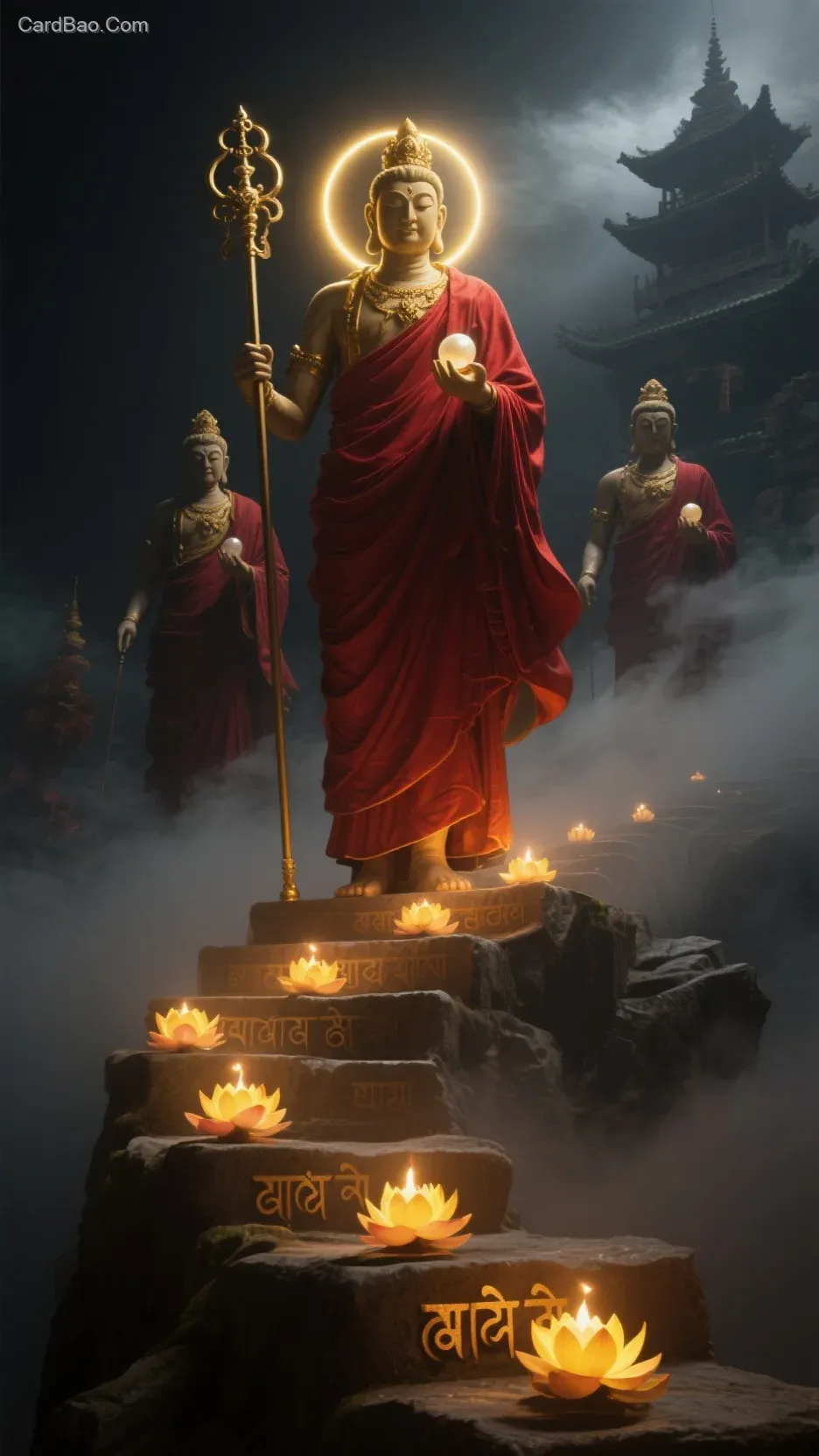 The Four Heavenly Kings Bodhisattva stands in the dark void, clad in red robes, surrounded by a golden halo. In the left hand, a staff is held, while the right hand cradles a luminous pearl. At the feet, several lotus lamps burn, their warm yellow light piercing through the gray mist to illuminate a winding stone staircase. Faint Sanskrit symbols float ethereally above the steps. In the background, the outline of an ancient temple is vaguely visible. Rendered in a hyper-realistic style with 8K resolution, using Unreal Engine, the scene combines dark tones with soft light. The intricate details of silk textures are clearly visible, captured from a low-angle, upward-looking perspective.