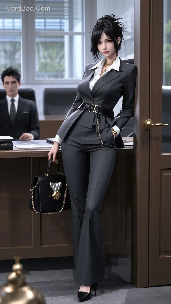 3d建模,一位黑色长发美女薇尔莉特,穿灰黑色戗驳领西装外套领口有镶嵌设计,内搭白色缎面真丝衬衫,下摆金属腰扣。下身搭配同色系微喇西裤,裤脚刚好盖住鞋面。脚穿黑色尖头细跟穆勒鞋,手提黑色皮质公文包,包上挂着金色链条和公仔装饰。佩戴潮酷金属混搭的项链,发型梳成低发髻,干练又摩登。倚靠在高端总裁办公室的总裁办公桌上,超现实风格,电影质感风格,,近景,强透视,景深,美学,,细节生动完美,厚涂,CG,3d建模。3d,绝美女子,非常漂亮,丹凤眼,刘海 发丝凌乱蓬松。显得休闲且时尚,增加精致感,自然,美丽,魅力,绝美脸庞,漂亮,近景, INS风韩国时尚感,厚涂,3d,建模,CG,韩娱,颜值担当,门面