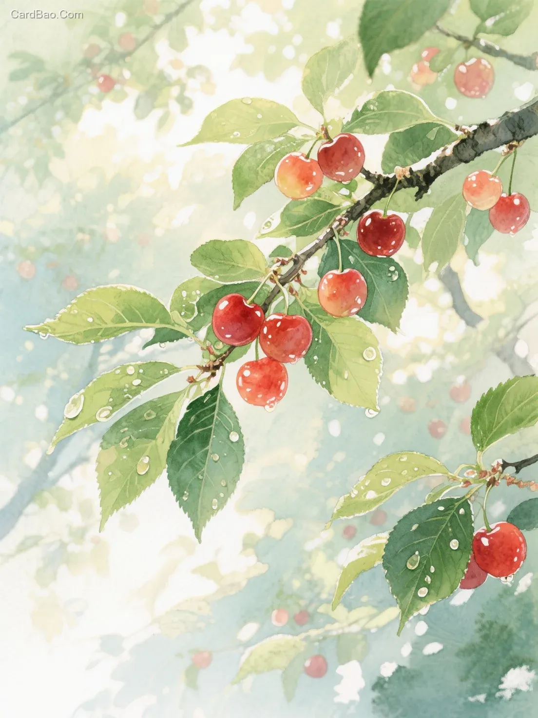 In a fresh, elegant, and softly colored cherry grove, sunlight filters through the branches and leaves, casting dappled shadows. The cherry trees are laden with glistening, translucent fruits. This scene is captured from a low-angle perspective, using a style that blends watercolor, gouache, light washes, and ink wash diffusion. The focus is on close-ups of large clusters of cherries and leaves, with dewdrops adding a touch of delicacy.