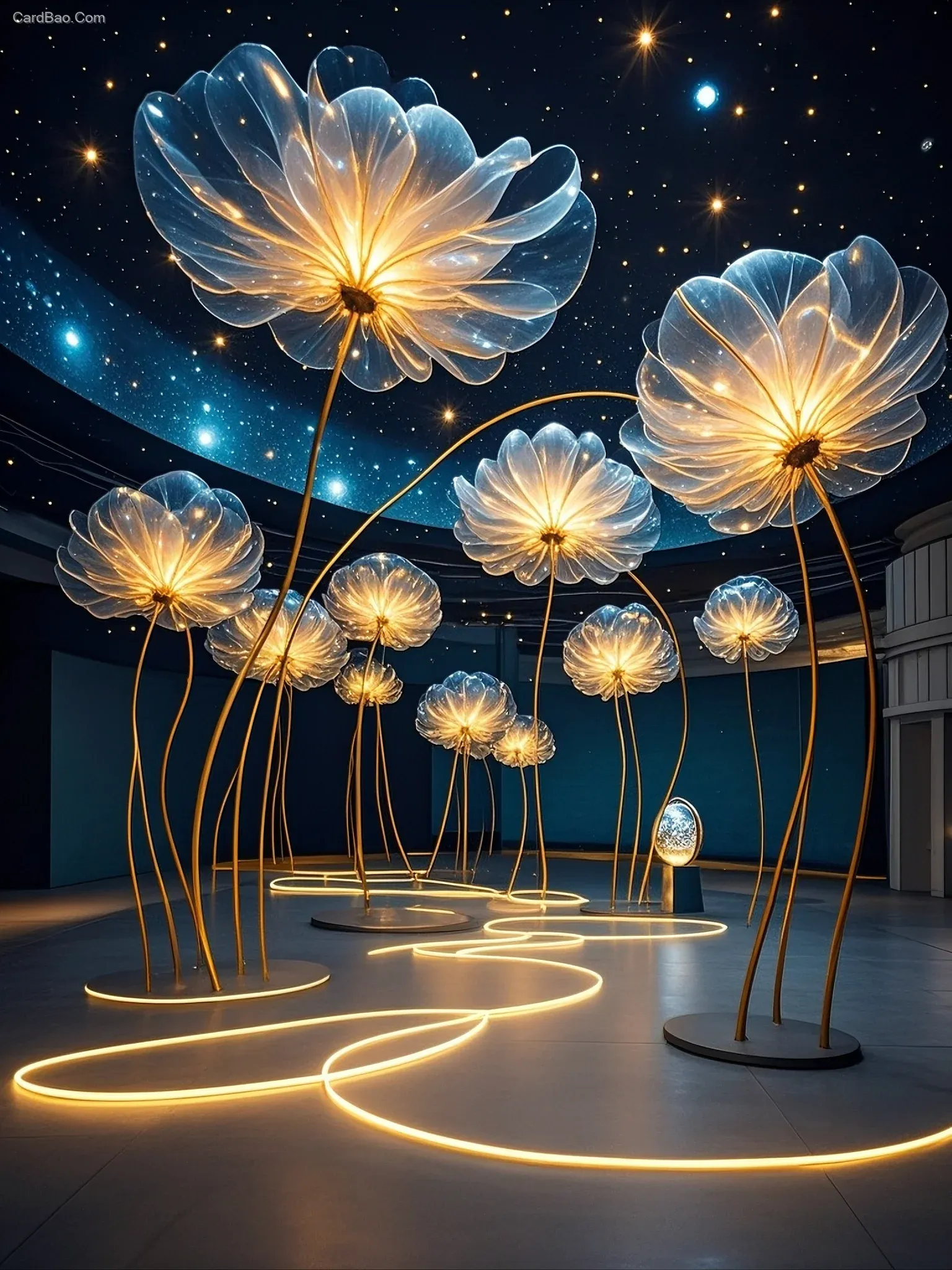 Simulate an interstellar crossing scene where ten glowing flowers extend from one end of the exhibition hall to the other, serving as beacons for space travel. Glowing iron wires mimic the linear feel of cosmic rays, while light bulbs create a starry, twinkling effect, guiding viewers through the space and immersing them in a romantic cosmic adventure.