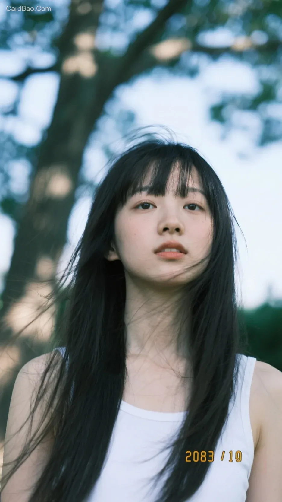 一张胶卷相片。灵动美少女,白色背心,长直发,空气刘海,斑驳树影,风吹动发丝,发丝凌乱美,颗粒感,冷调,有照片拍摄日期
