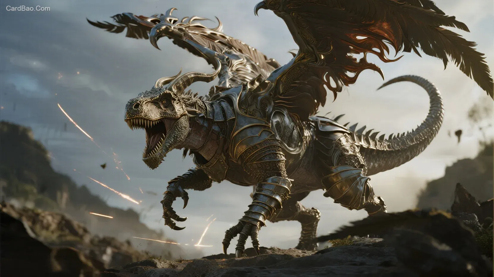 An otherworldly dinosaur-humanoid figure formed from liquid metal, featuring a head resembling a liquid metal velociraptor. Spiky, metallic feathers cascade like sharp spikes from the back of the head, while a tightly fitted metallic faceplate outlines a fearsome dinosaur-human visage. The figure is clad in tattered, full Western-style plate armor, with both forelimbs extending long, high-frequency claw blades. Masterful, extreme, clear, dynamic, liquid, menacing, and tattered. Loish. CG art style, fluid art style, fantasy style. OC + CG + C4D rendering, dynamic layering, extreme texture, tactile feel, contour lighting, with sharp and intricate details. Low-angle upward shot. Aspect ratio: 16:9.