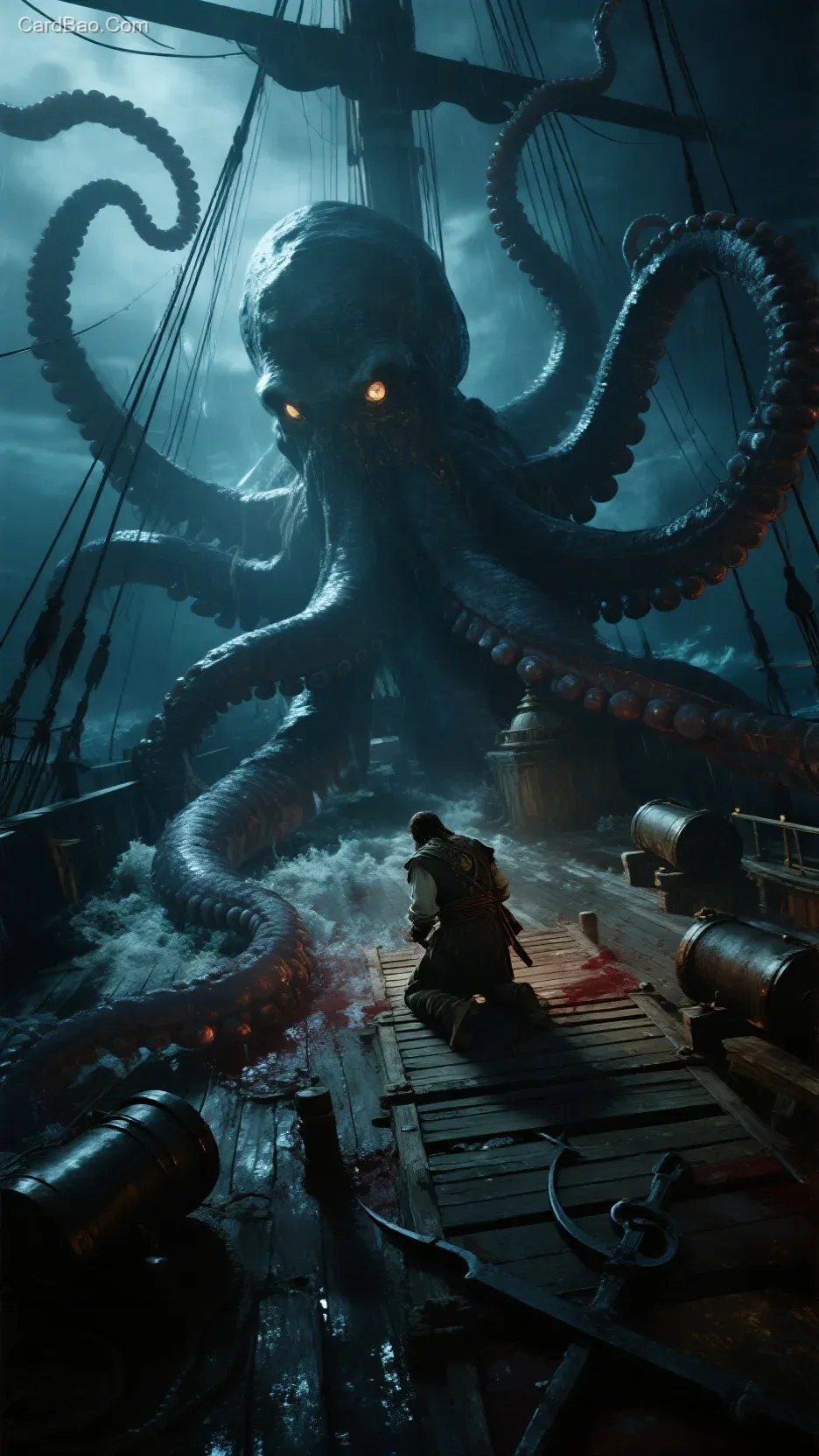 Screenshot from the game "Dark Souls," third-person perspective, with a background evoking megalophobia. The scene is set in a massive 18th-century Caribbean Sea-style environment. Features include the wreckage of a ghost ship, a colossal deep-sea tentacle as the main subject, depicted in a constricting and strangling pose. A pirate is shown kneeling on the ground, having abandoned his cutlass. The environment is dimly lit with a blue tone, illuminated by top-down lighting, rendered in a game CG style. Textures include rotting wood and slimy surfaces, with strong contrasts between light and shadow. Elements such as bioluminescence and thunderstorms are present, with bloom effects applied. Shadows in dark areas are deepened to evoke a sense of solitude and an epic narrative. The scene is grand and majestic, incorporating structural elements of a pirate ship. Details include suction cup ring-tooth textures, mirror-like reflections of accumulated rainwater, slanted deck passages, blood-soaked tattered canvas sails, rusted anchors and cannons, salty sea mist and slimy foam, all within a cool color palette. The composition features a diagonally overturned ship hull, creating an oppressive viewpoint. The scene is intricately sculpted with detailed carvings, conveying a sense of historical weight. The atmosphere is mysterious, the space expansive, emotions feel detached, and the visual impact is striking, with a rough, textured finish.