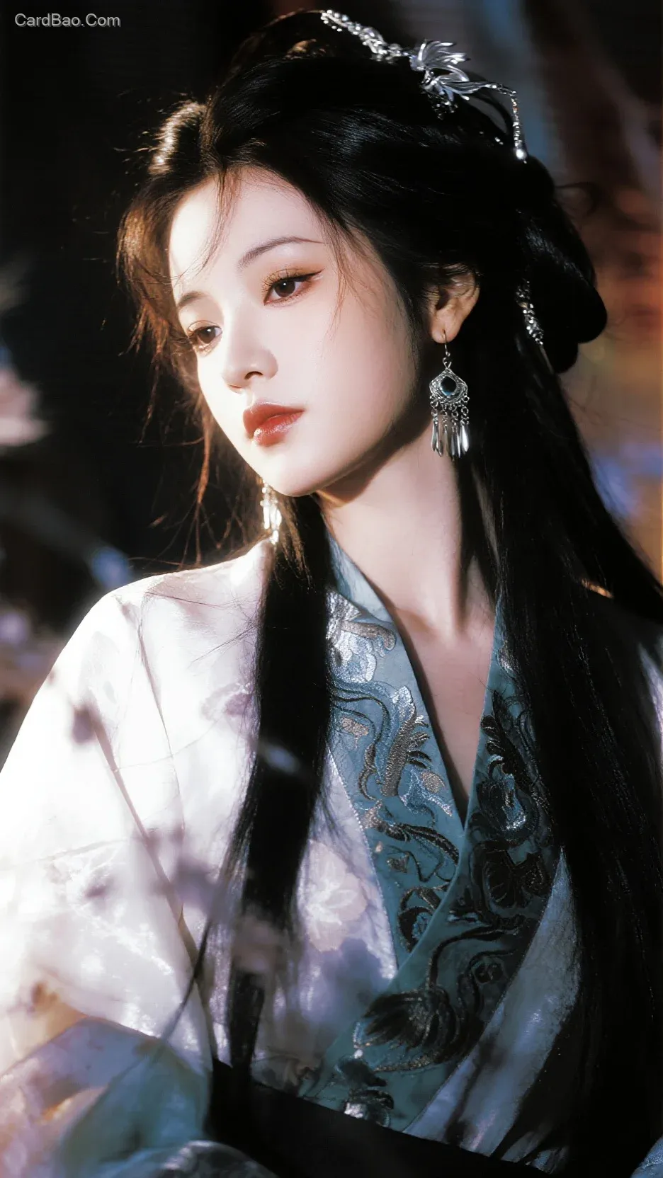 Enchanting, alluring, and languid, a classical Chinese beauty, the Miaojiang enchantress queen, adorned with simple silver headpieces, her hair cascading naturally like a waterfall down to her waist, wearing large dangling earrings.