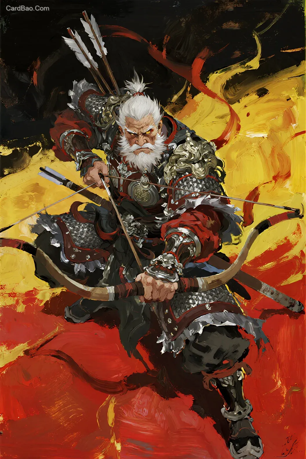 Red, yellow, and black color scheme, extensive silver foil texture, the Three Kingdoms veteran Huang Zhong with white beard, enormous bow and arrow in an attacking stance, savage armor, liquid metal, muscles on the verge of explosion, eye shadow, creating a sense of awe through a top-down wide-angle perspective, bold and unrestrained, highly individualistic, battle scene, ultra-thick impasto paint applied with a palette knife, texture, Fauvist style, rough brushstrokes, with the raw texture of splattered acrylic paint preserved along the edges of the canvas.