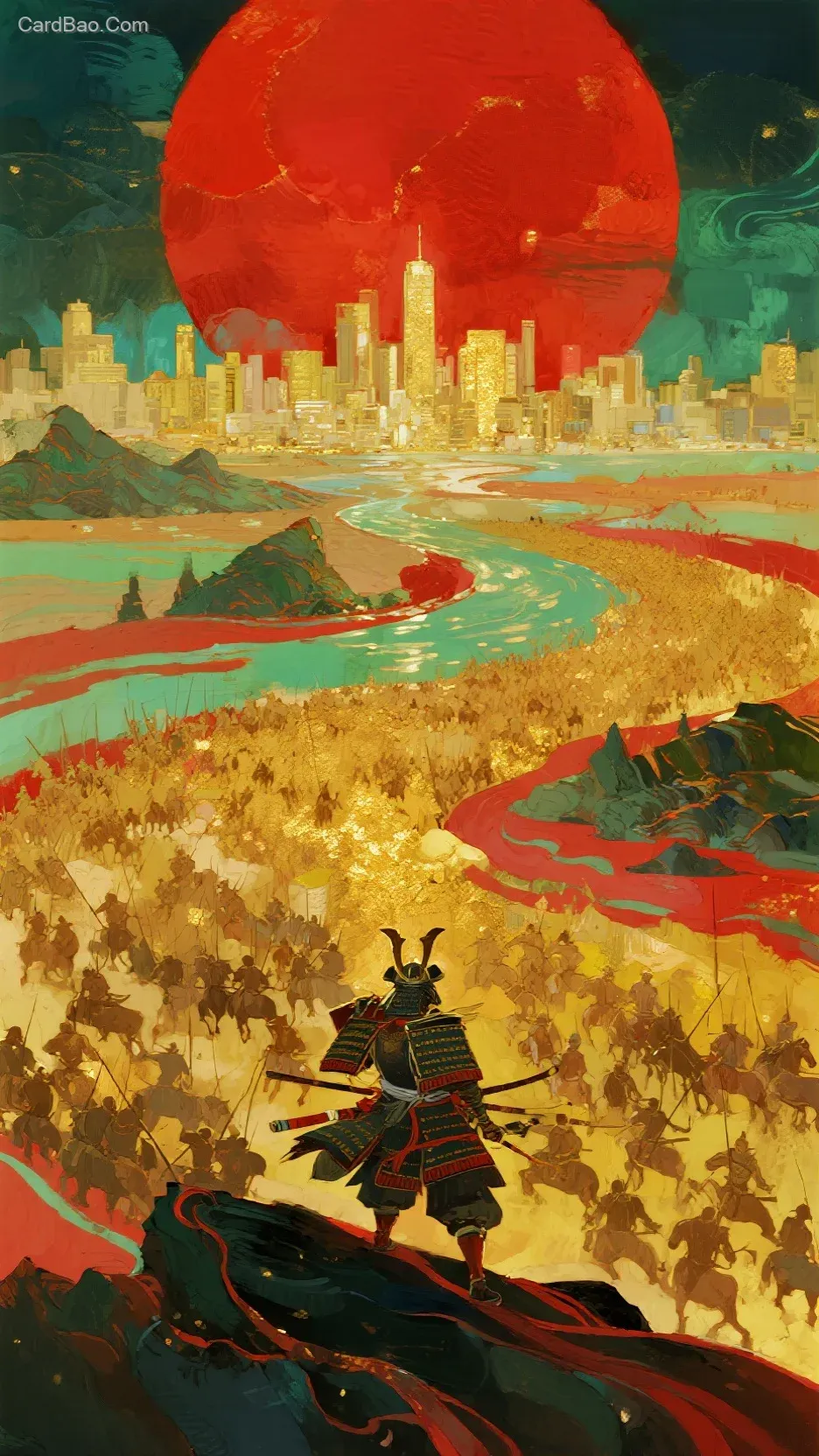 Gold foil mineral pigment painting, a chaotic world, a samurai standing above a vast army, with the distant skyline of Shanghai in the background. The color palette is distorted and warped, featuring a massive red sun, countless mountains and rivers, shimmering light reflections, a grand era, the birth of a hero, an overwhelming presence, perfect color composition, explosive layout, the flow of qi, and gradient blending.