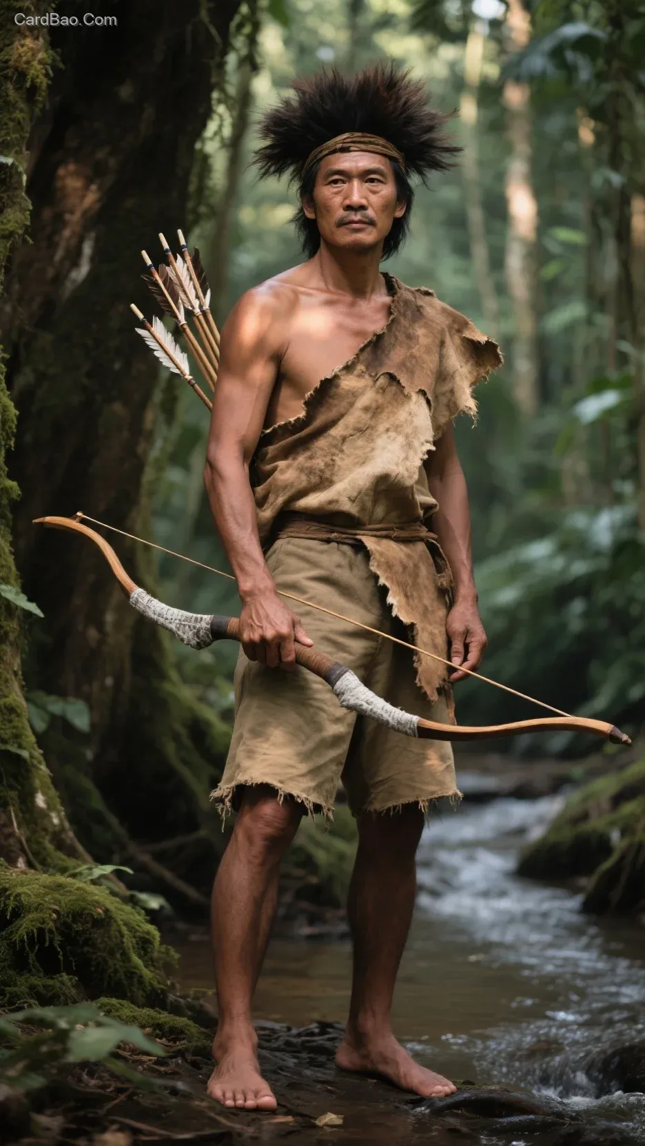 姿势 为双脚分立的站姿,身体挺直,随时准备打猎,姿态沉稳自信。 摄影用光 属自然光,侧光勾勒躯体轮廓与布料纹理,阴影强化立体感; 画面色调 偏暖棕,质朴粗犷。 背景 是云南热带原始森林,茂密老树长满青苔,一条细细的溪水流过,烘托出原始生存氛围 。