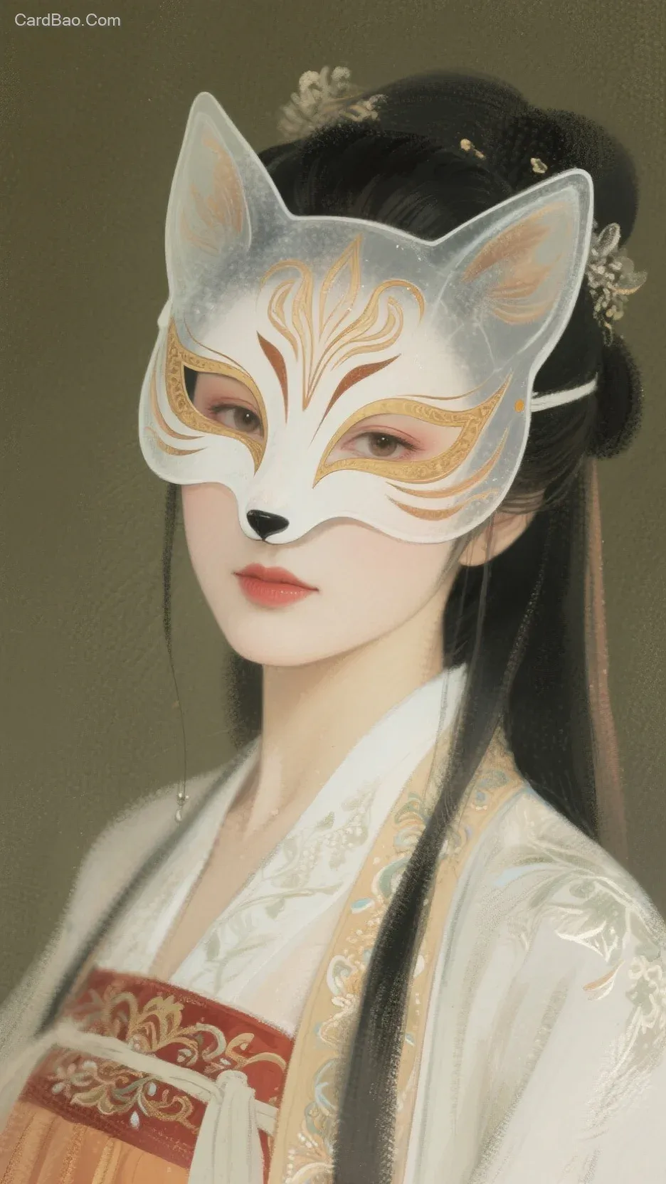 古装美女真人cos,带着一个古朴美观的狐面具,画工高超,画风细腻处于纯色背景的场景中,绘画风格,特写镜头,神秘美学、梦核氛围,清爽不油腻、若隐若现、透明、模糊朦胧、空灵迷幻、美丽庄严、边缘模糊、晕染的修饰效果,轻微的磨砂质感,水彩油画风格。比例 9:16。