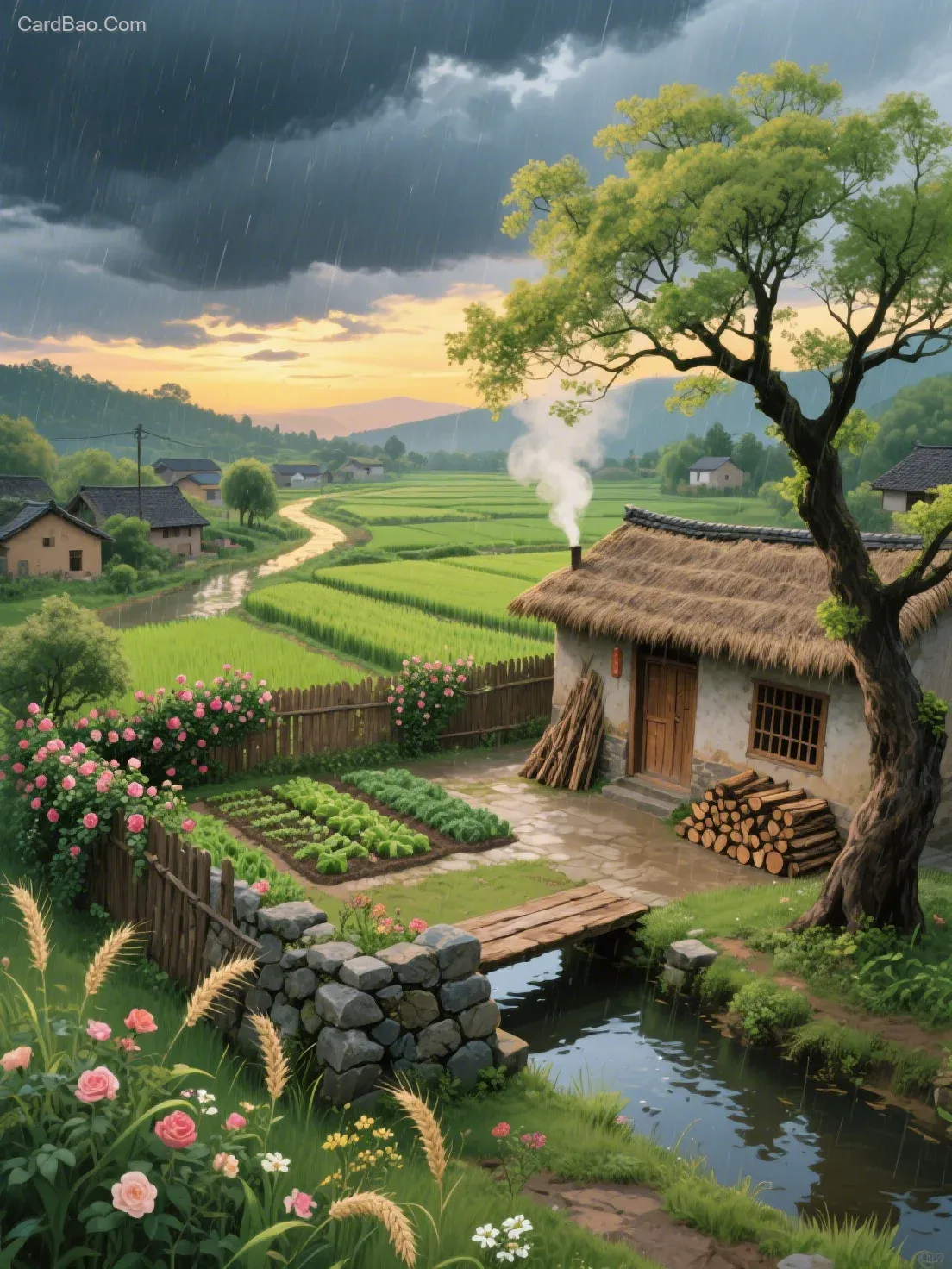 A semi-bird's-eye view of a rainy spring evening in a Chinese rural village. Scattered single-story houses form the village layout, with rough stone walls enclosing spacious courtyards. Wooden fences are covered with climbing roses and Chinese roses, while ancient locust trees stretch their gnarled branches. Beside the courtyards, lush green rice fields connect with neatly arranged vegetable plots. A clear stream reflects a small wooden bridge, and stacks of chopped firewood are piled under the eaves. Dark clouds tint the sky with a gradient of deep indigo, while high saturation colors highlight the texture details of wooden doors and windows. Strong contrasts of light and shadow emphasize the texture of thatched roofs. The 32K ultra-high-definition image captures the brushstroke-like details of wildflower petals and rice ear awns, presenting a panoramic view of cooking smoke curling upward in the golden twilight.