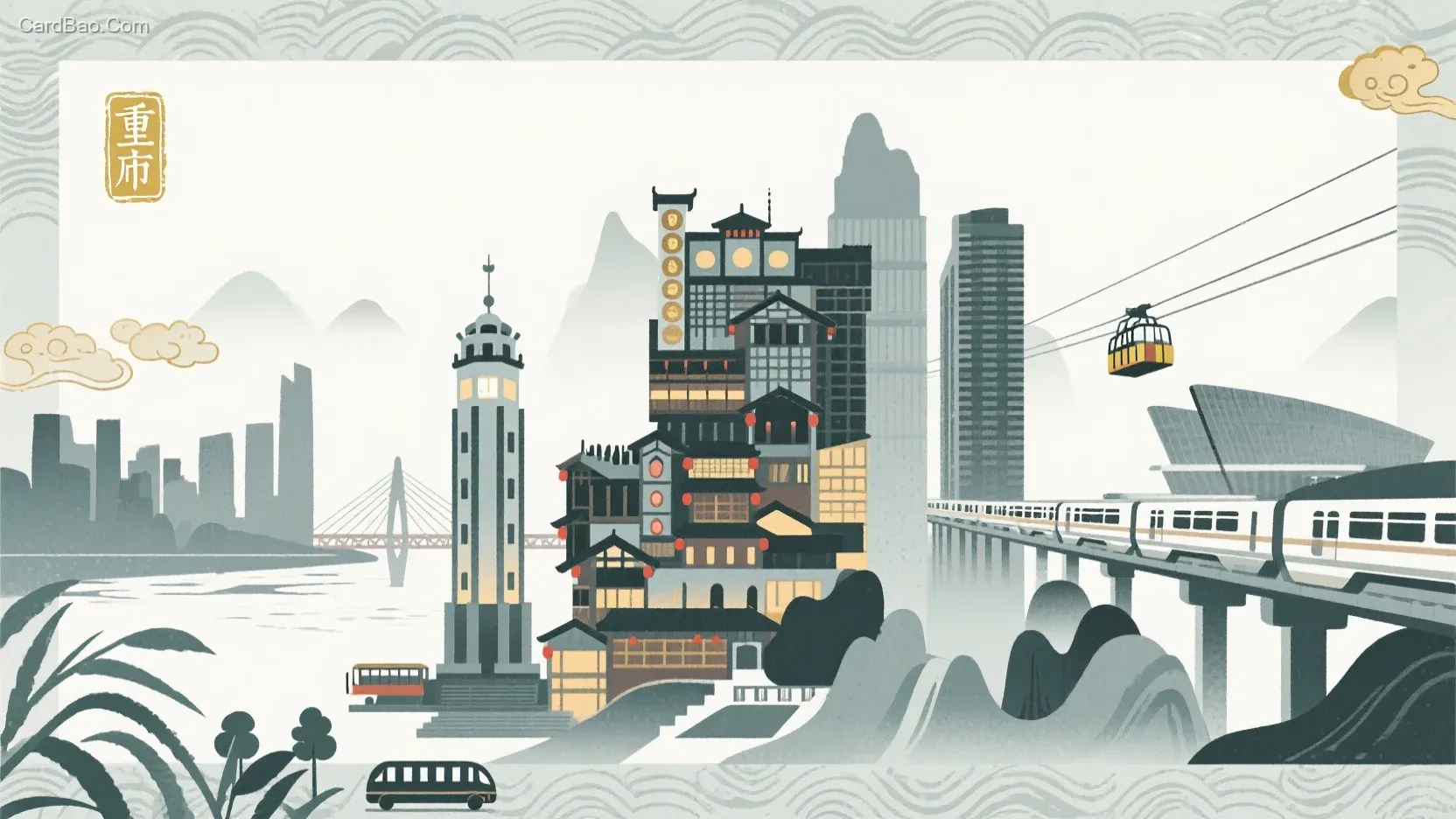 对称式构图,地标建筑居中,前景添加城市特色元素(如植物/交通工具),背景融入山水或城市剪影,留白处理画面风格: