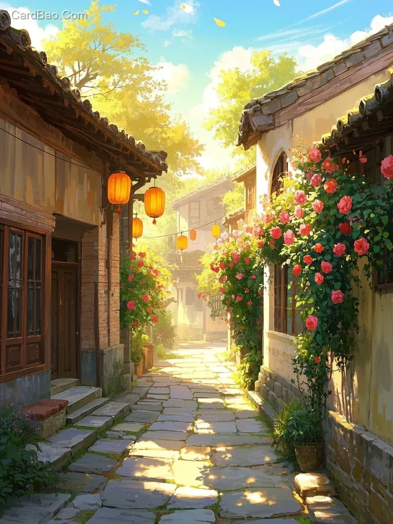 写实风格,手绘构图,古朴小巷场景。石板地面的小巷,两侧是老式砖瓦房,房檐悬挂着古朴的灯笼。小巷房前屋后的墙面都开满了密密麻麻的鲜艳的蔷薇花,光线柔和,空气透视,营造出朦胧氛围。整体氛围静谧、怀旧、唯美治愈。