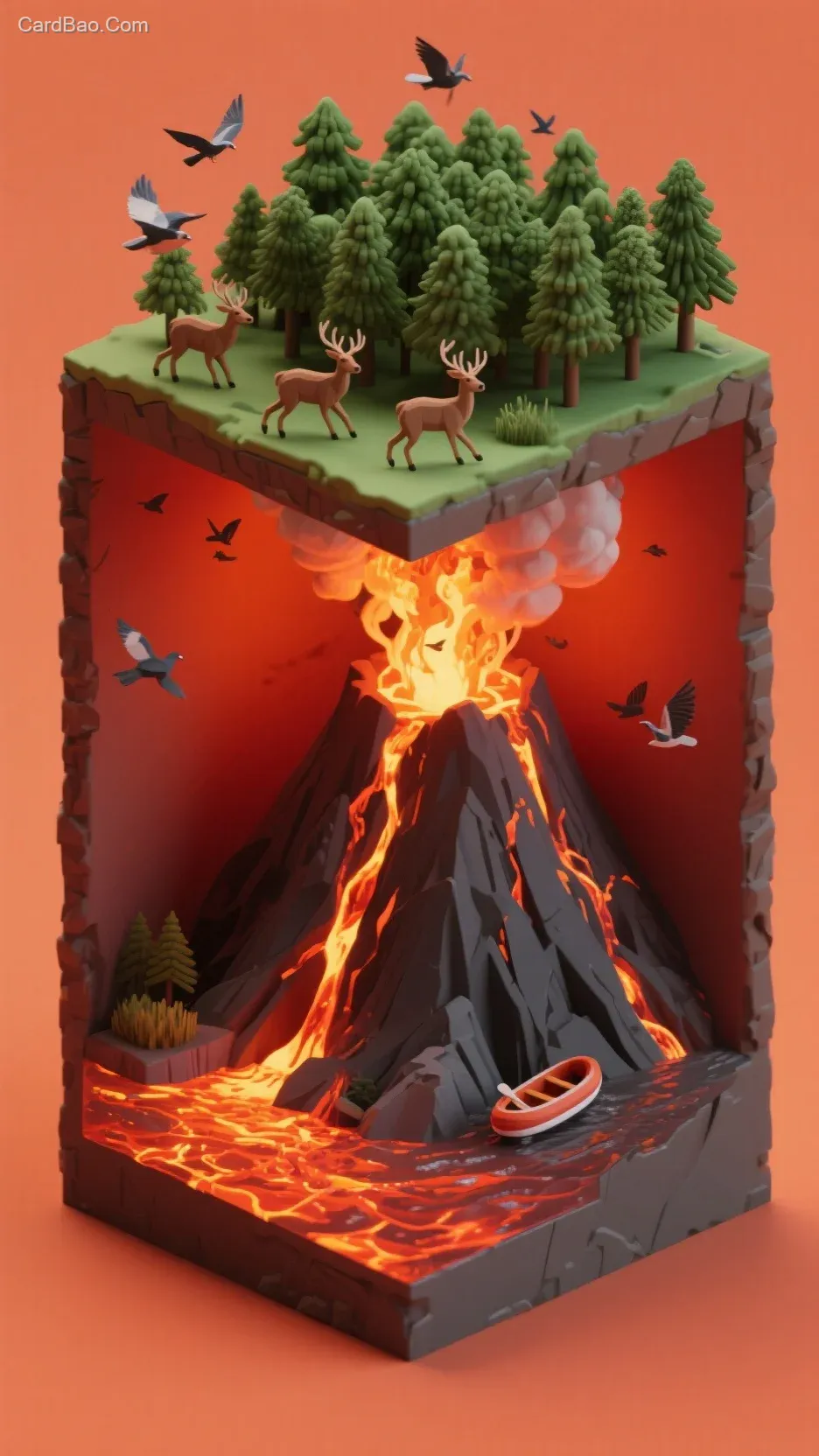 一个正方体立体微缩景观展现漂流场景,等距视角立方体构图,截取一座活火山山体的生态截面,山体中部熔岩翻涌,顶部是茂密森林,有鹿群奔跑避开火山喷发,空中有惊飞的鸟群,地底可见岩浆通道与热气上升。写实风格,橙红色调与森林绿强烈对比,立方体结构清晰,充满动感与自然张力。背景为纯色。