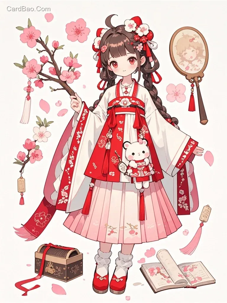 Kolling布局,一个可爱的拟人桃花,上身汉服裙子,桃花花枝,可爱的配饰,卡通设计,全身,主体周边各种小物品,平面插图,贴纸风格,描边线条,森系水彩,高细节,高分辨率,二次元,q版