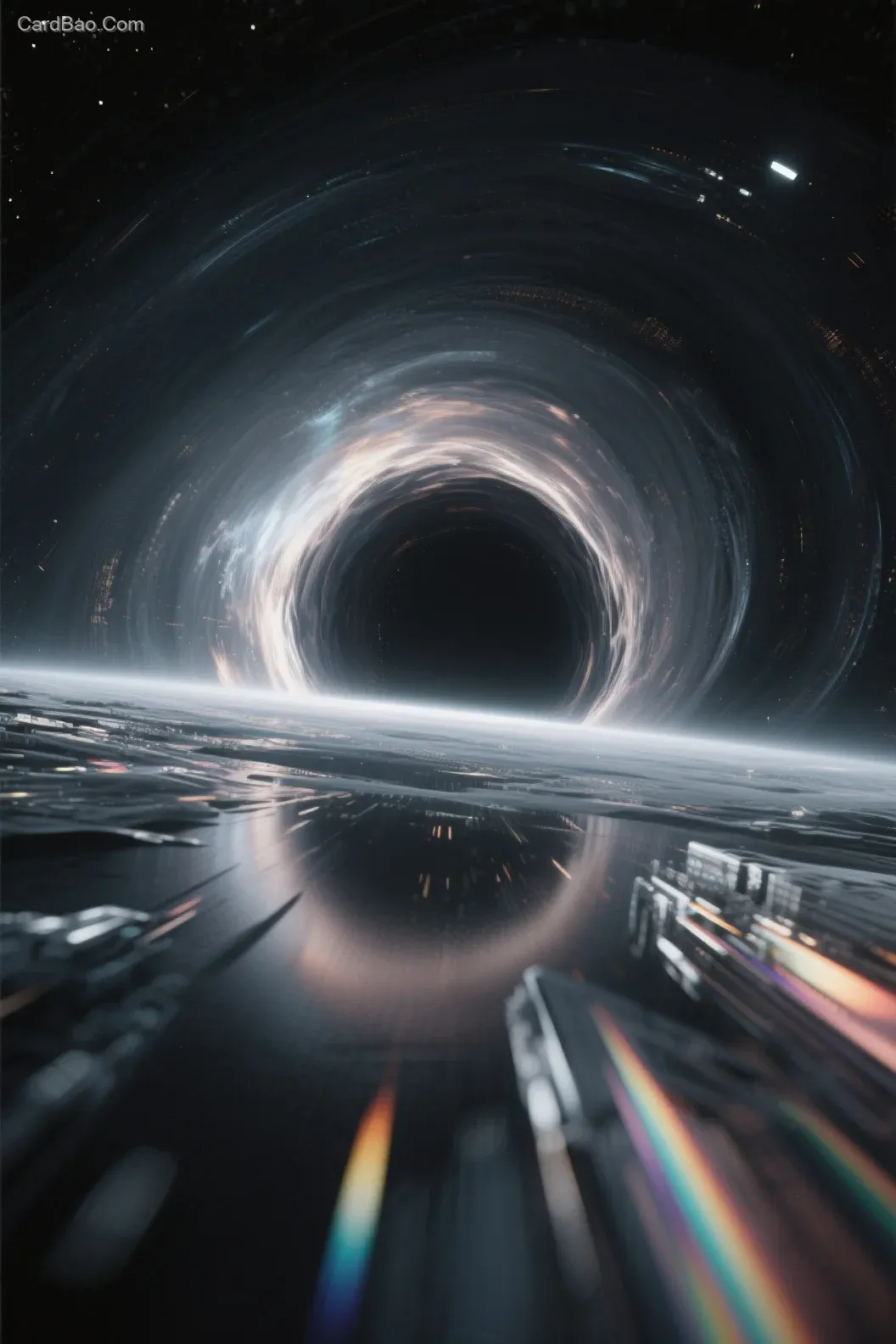 Interstellar travel, black hole, C4D, 3D modeling, Octane rendering, ray tracing, motion blur, depth of field, surrealism, deep gray. The image shapes the subject and scene through delicate and rich color layers, with a realistic texture. The lighting and shadow effects in a dark-style background create an atmospheric vibe. The overall composition combines artistic fantasy with an exaggerated wide-angle perspective effect, lens flare, and reflections.