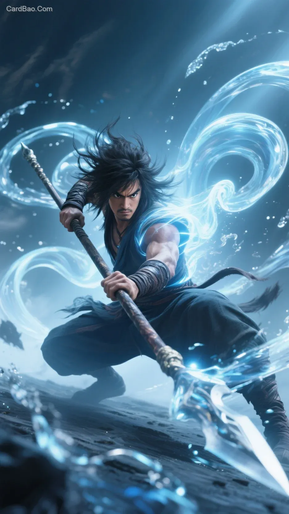 冷静的表情,弓步姿势大幅度夸张动作,双手持长槊,蓄势待发,准备进攻,强镜头畸变,低角度。镜头炫光,步惊云特写,强调眼部,光绘感,无数透明水质感螺旋线条。狂风吹的头发超级凌乱。真实电影概念图。