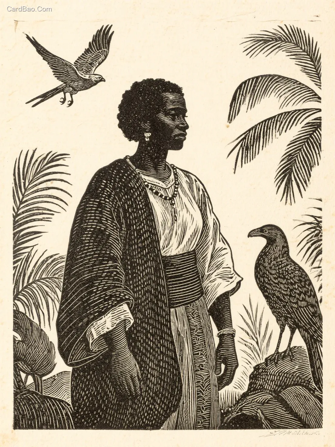 写实风格人物飞禽走兽热带植物,周围留白,泛黄的纸张,凹版印刷,黑白图片,精致的线条细致线条刻画细节,0.01毫米线条,黑白灰关系,以点线表现明暗关系,大师级排线,细致的细节