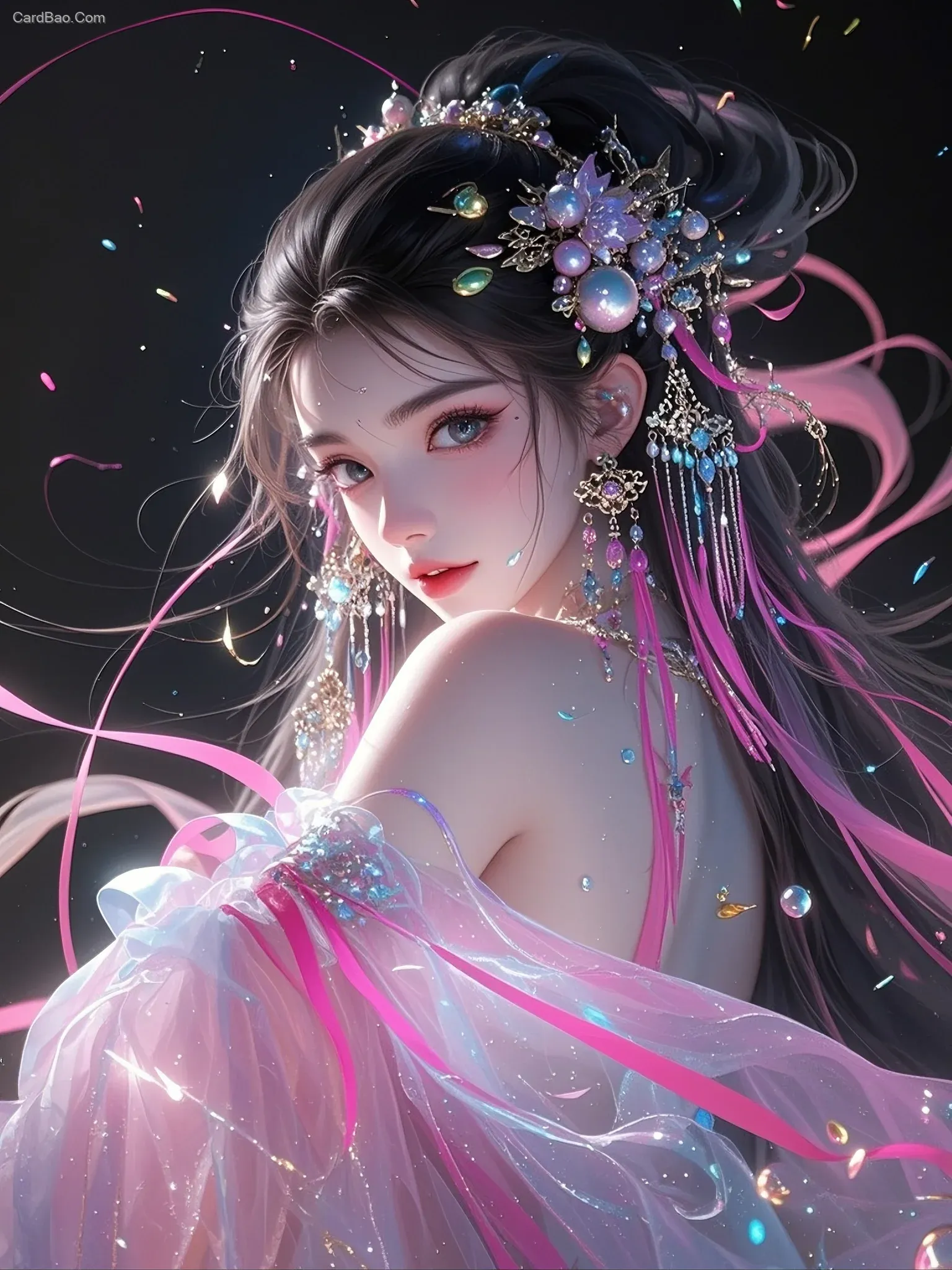极致超清,极致细节,3d模型,美女,虚拟引擎背景透明,柔焦,华丽光影 淡粉色调,仙气飘飘,珠光,反光,发亮发光,色彩鲜艳,鲜明,对比强烈,高饱和度,流苏 ,梦核,唯美,长发 美人,魅惑,面部特写,细腻,杂乱,艺术,复古色调,戏服,景深,精致,杰作,极致细节,金银珠钗,画面复杂,具有特色,创意,创新,板绘厚涂,高傲,冷色调,露出后肩膀,柔和灯光,超清画质,面容精致,眼睛细化,特写镜头,流体艺术,高细节,仙气,纱制衣服。朦胧破碎,忧伤