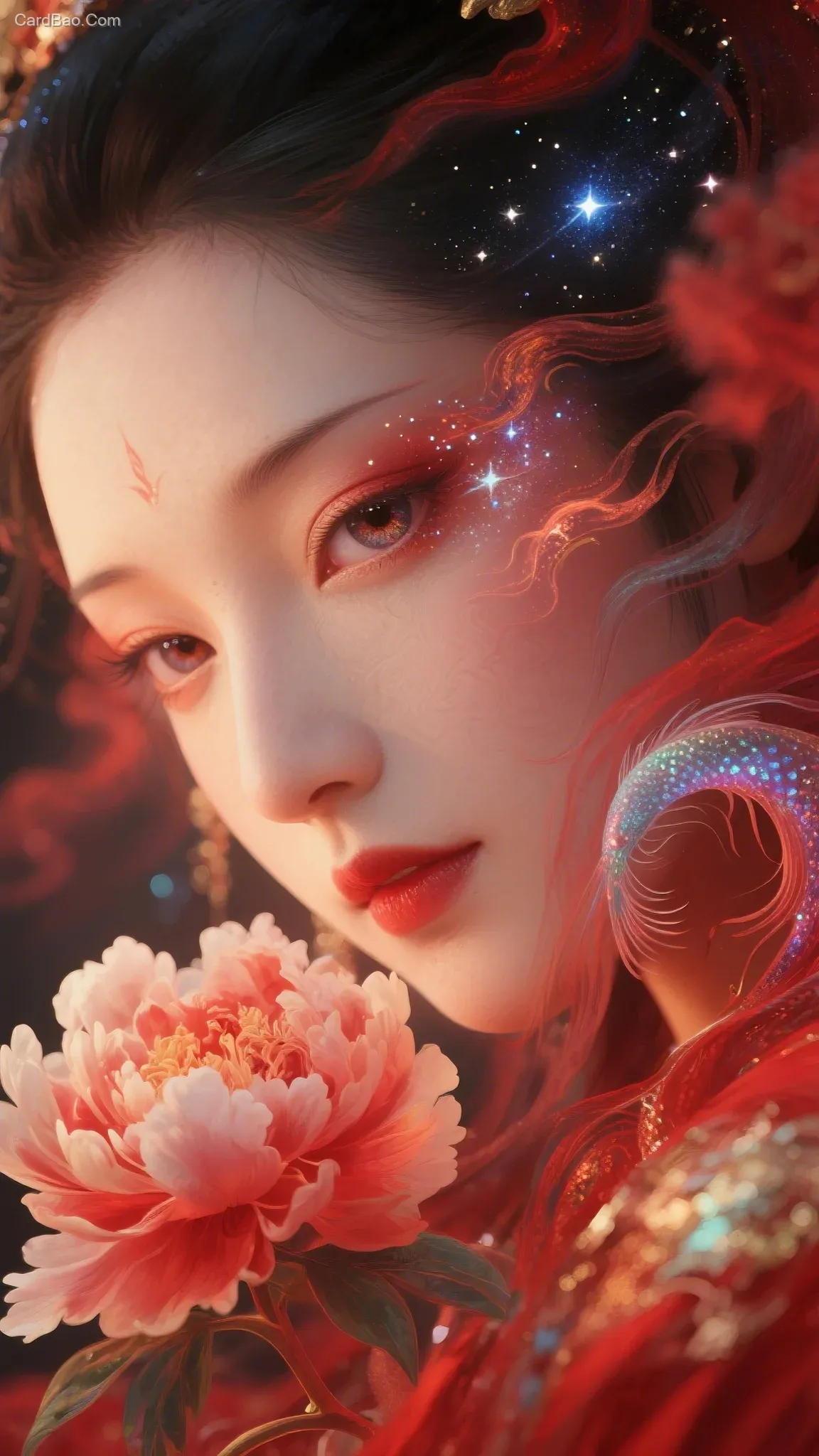 牡丹花妖星河灿烂的眼眸,从眉眼间飘过行云流水和万千星展,面部特写,玄幻缥缈的,脸部特写,杰出的,大师杰作品,国风油画,岩彩板画,。古风意境,暖色系,朦胧,迷幻,弥散渐变,层次感,梦幻,超现实主义美学,空灵,如梦似幻,近景,极致写实油画。绝美光影,三维古风,微距摄影,移轴拍摄,高角度拍摄,浪漫古风,电影光,生物学发光,鲛人,大唐盛世氛围,华丽惊艳氛围带浪漫感,高贵优雅,朱砂红色调